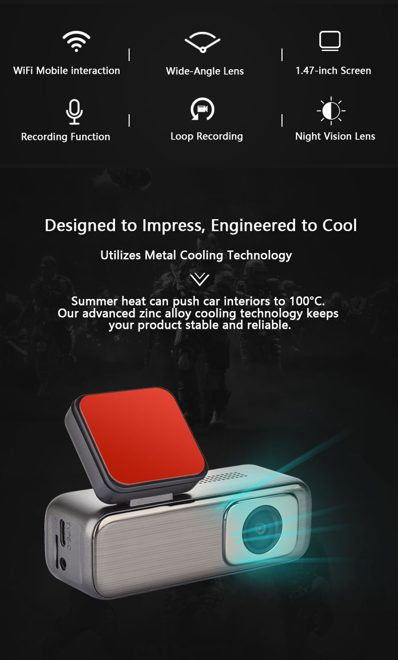 - Advanced Heat Management: Built with advanced metal cooling technology, this dashcam can withstand extreme temperatures up to 100℃. The zinc alloy body ensures stable and reliable performance in various conditions.