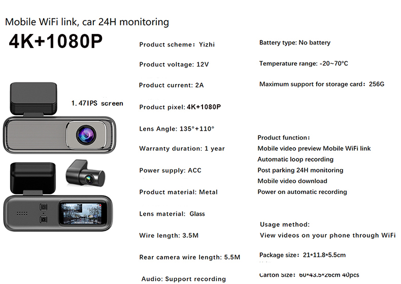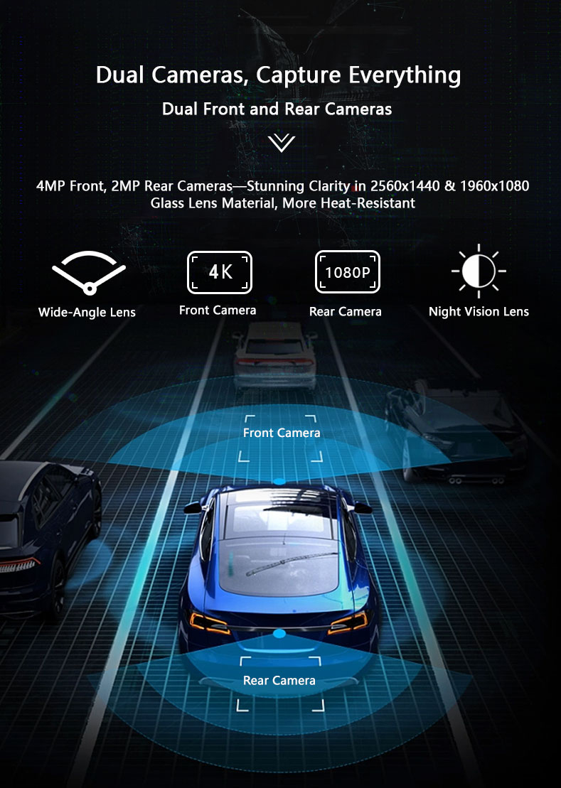 - High-Resolution Dual Cameras: The dashcam features a 4K front camera and a 1080P rear camera, ensuring ultra-clear video quality. Capture every detail both day and night with precision and clarity.