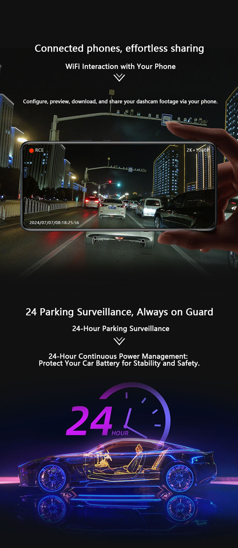 - 24-Hour Parking Surveillance: Keep your vehicle secure and monitored 24/7. The dashcam automatically activates parking surveillance mode, giving you peace of mind even when you're away from your car.