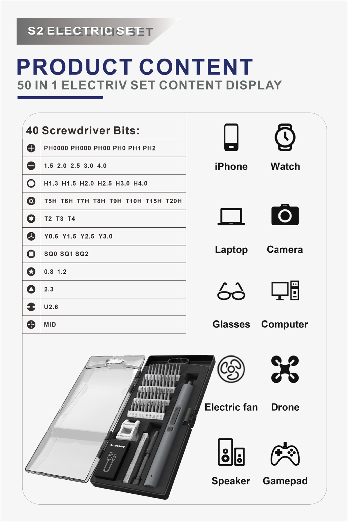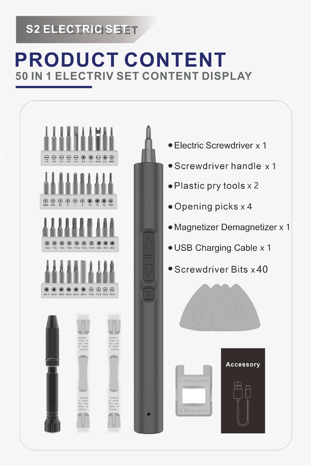 mso-bidi-font-family:'Times New Roman';font-size:10.5000pt;mso-font-kerning:1.0000pt;'>Comprehensive 50-in-1 Kit: The kit includes a wide range of 40 screwdriver bits, catering to various screw types and sizes. Additional accessories such as plastic pry tools, opening picks, a magnetizer demagnetizer, and a screwdriver handle are included, making it a versatile toolset for electronics repair, DIY projects, and general maintenance tasks.mso-bidi-font-family:'Times New Roman';font-size:10.5000pt;mso-font-kerning:1.0000pt;'>