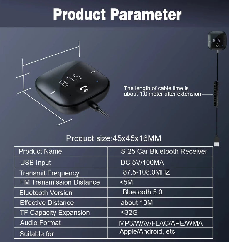 - User-Friendly Design: The compact size of 46x46x13.5mm makes this device easy to use and install in any car. The interface includes a convenient 3.5MM AUX OUT, providing a simple and efficient way to transmit audio to your car's sound system.