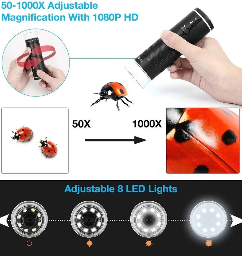 2. Magnification & High Definition: 2 million pixels(Wifi version), three hundred thousand pixels(3 in 1 version), 1080P HD picture quality for smartphone, 720P for computer, 50x more magnification can meet your daily needs. Built-in 8 Dimmable LEDs provide enough illuminance.