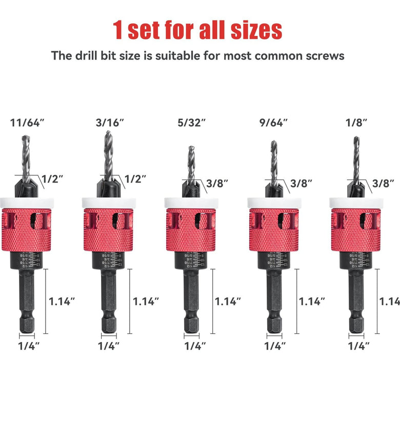 • 5PCS 1/4 Inch Hex Shank Countersink Drill Bits Set with Low Friction Stop for Wood Plastic MDF Drilling