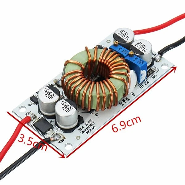Module name: 250W boost static current moduleModule properties: non-isolation boost module (BOOST)Input voltage: DC 8.5-48VInput current: 10A (MAX), if exceeds 8A, please strengthen the heat dissipationStatic working current: 10mA (12V up 20V, the higher the output voltage is, the higher the static current will increase)Output voltage: 10-50V continuous adjustable if necessary (default output 19V delivery)Output current: 10A MAX, if over 6A please strengthen heat dissipation. (Related to the input and output voltage difference, the larger the voltage difference is, the smaller the output current is)Constant current range: 0.2-8AOutput power = input voltage * 10A, for example: input 12V * 5A= 60W, input 24V * 5A = 120W, input 36V * 5A = 180W, input 48V * 5A= 240WIf you need more power, you can use two modules in parallel, such as the output of 10A, which can be connected in parallel with two modules, transfer the current of each module to 5A.Working temperature: -40 - +85℃ (please strengthen the heat dissipation when the ambient temperature is too high)Work frequency: 150KHzConversion efficiency: maximum 96% (efficiency is related to input/output voltage, current, voltage difference)Over-current protection: yes (if more than 13A, it will automatic reduce the output voltage, a certain range of errors)Input reverse connection protection: yes, (less than 5A if you need more reverse connection current in the input string)Install mode: 4 3mm screw holesConnection mode: wiring outputModule size: 69 x 35mm