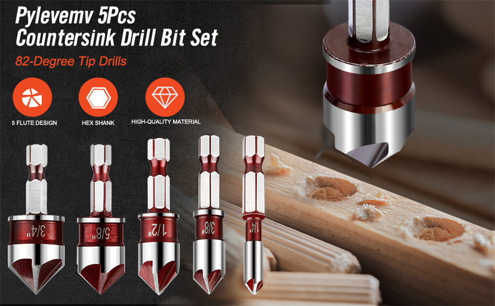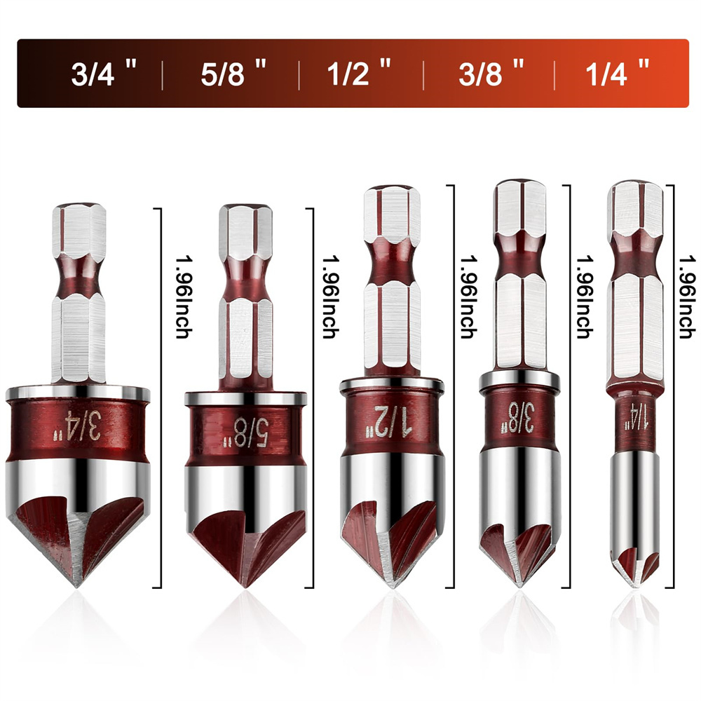 • 5Pcs Drill Bit Set Premium Countersink Drill Bit with 82-Degree 5 Flutes Quick-Change Hex Shank 1/4 Inch to 3/4 Inch Size for Wood Metal Plastic