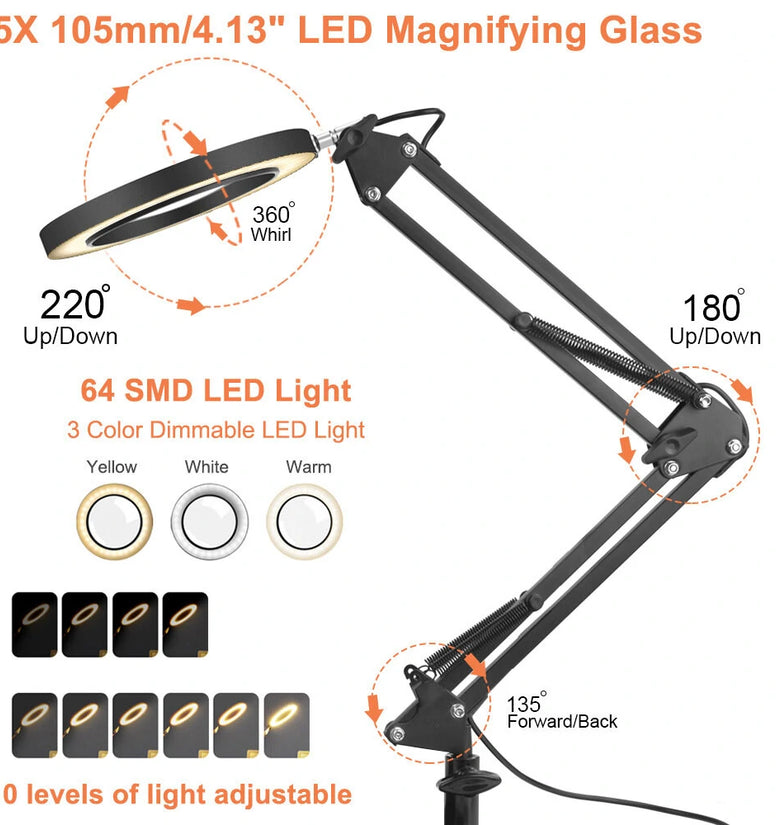 mso-bidi-font-family:'Times New Roman';font-size:10.5000pt;mso-font-kerning:1.0000pt;'>LED Magnifying Lamp: This magnifying lamp is equipped with 64 surface-mounted LED lights, offering three adjustable color temperatures (white/warm/yellow) and 10 levels of brightness. It provides optimal lighting for various working environments.mso-bidi-font-family:'Times New Roman';font-size:10.5000pt;mso-font-kerning:1.0000pt;'>