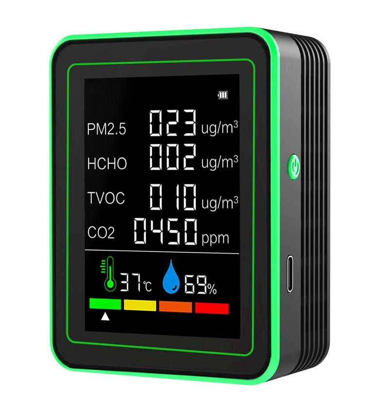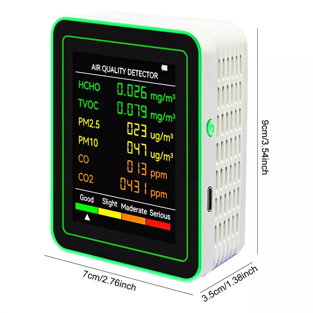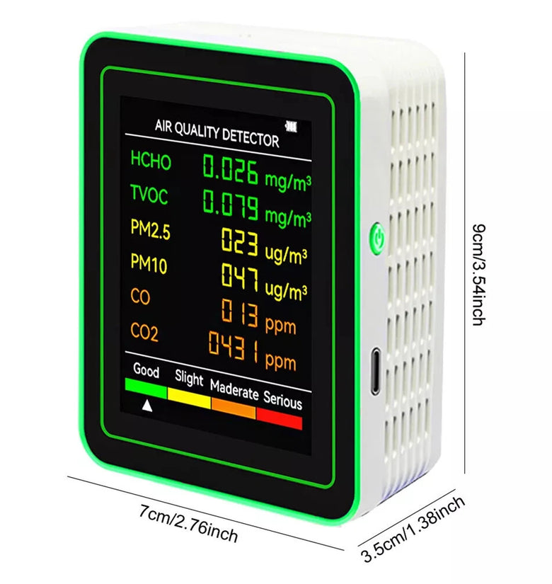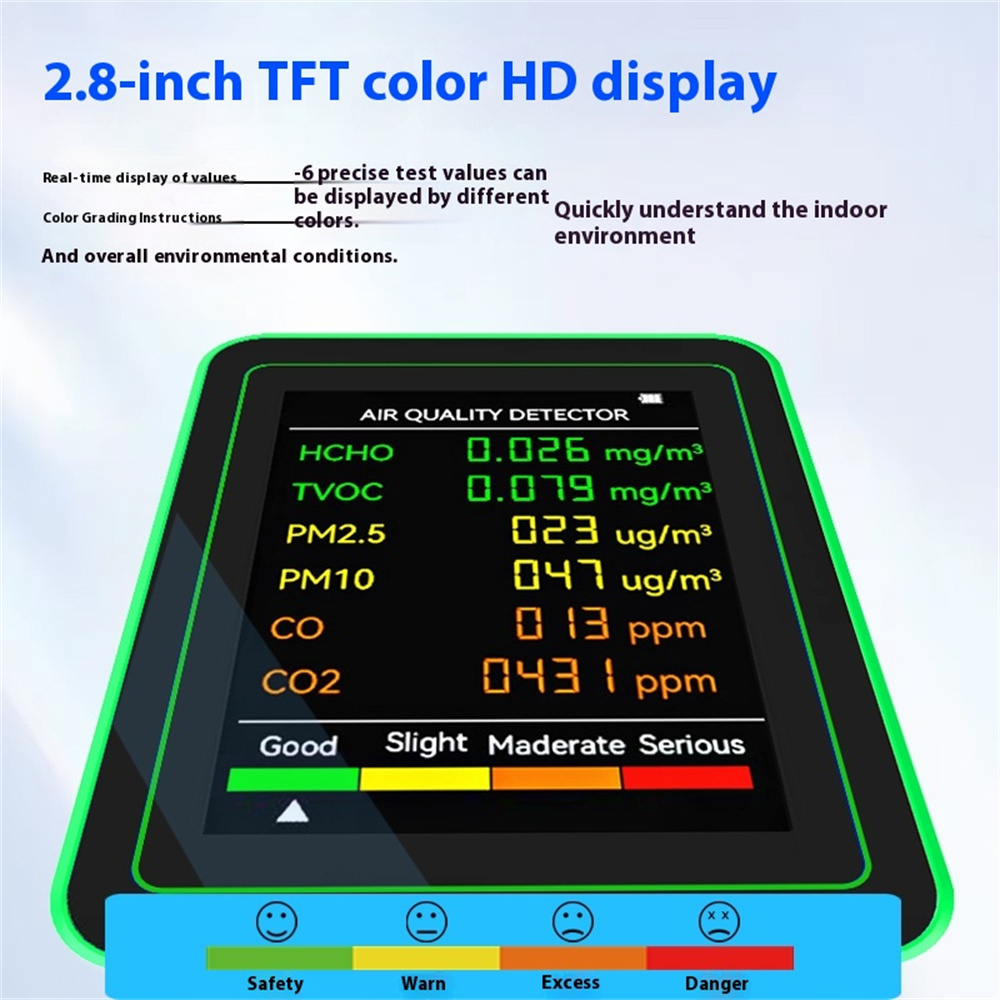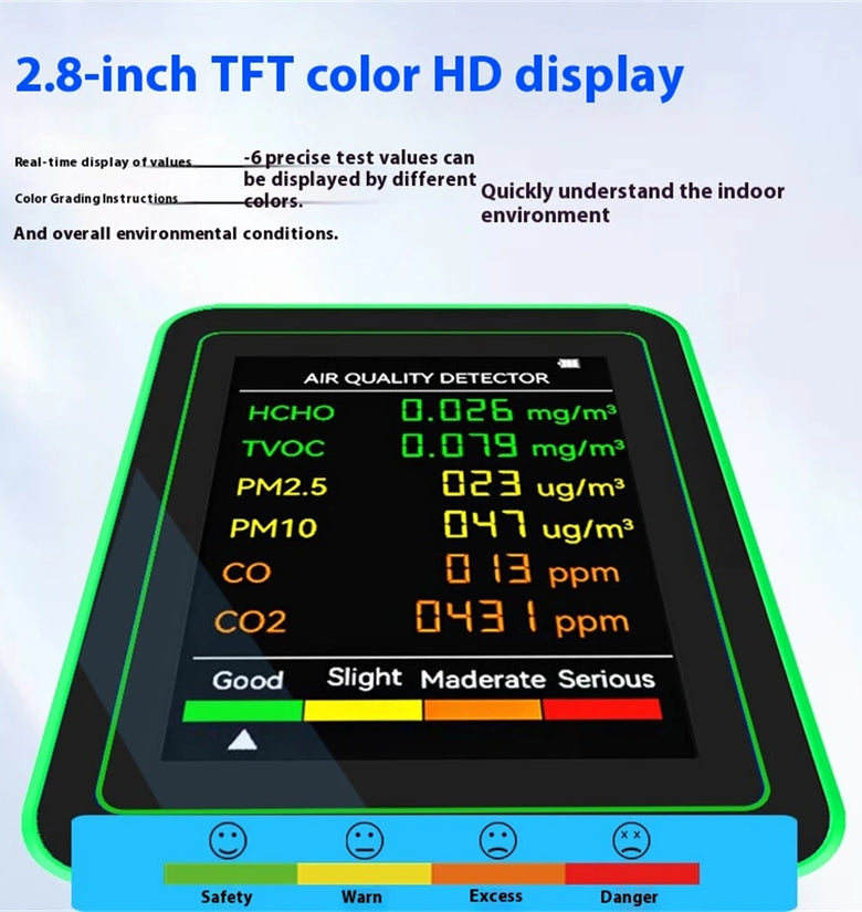 User-Friendly Interface: Clear, color-coded display indicating air quality levels for instant and easy readability.