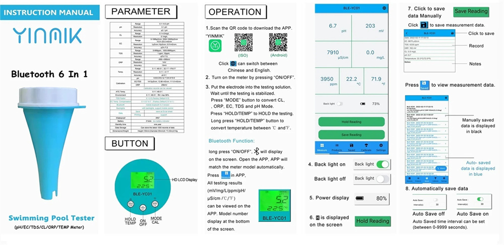 1) 6-In-1 Detecting Function: This water quality tester can measure the PH, Total Dissolved SolidsTotal Dissolved Solids, EC, temperature and chlorine in water for you and help you fully understand the water quality of the tested water.