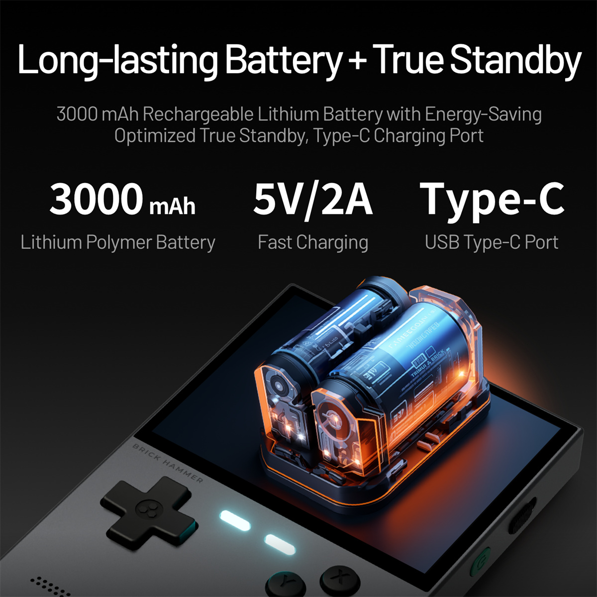| Ports | 1. Top Type-C: USB Host (for game handles) 2. Bottom Type-C: Charging & OTG port 3. TF card slot |