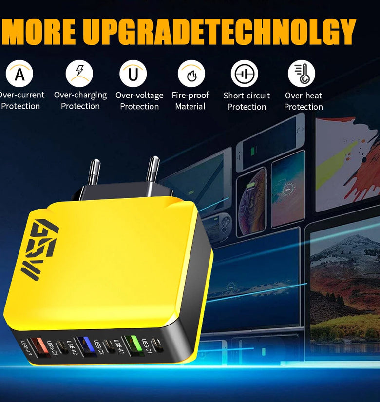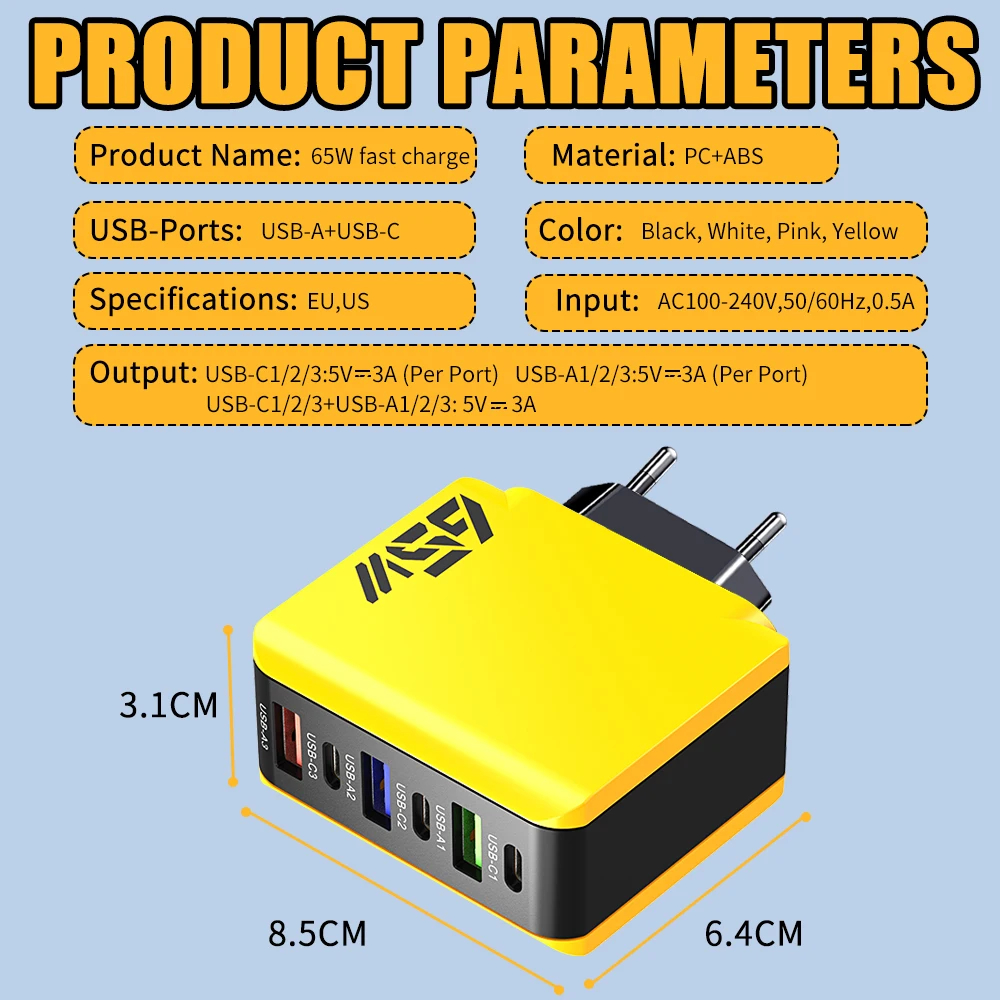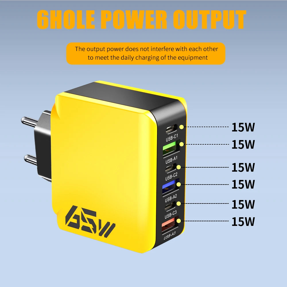 • 65W 6-Port USB PD Charger 3USB-A+3USB-C PD QC3.0 Fast Charging Wall Charger Adapter EU Plug US Plug for iPhone 16 16 Pro 15 14 13 Pro Max for Samsung Galaxy Z Flip 6 for Huawei Mate XT