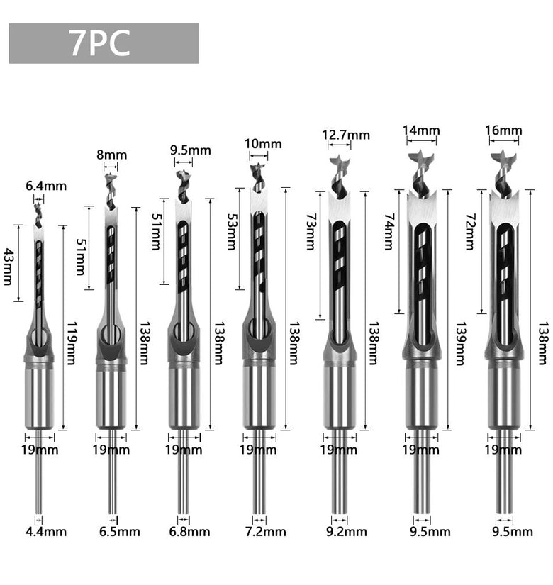 • 7PCS Woodworking Square Hole Drill Bit Mortising Chisel Drill Auger Drill Core Spade Drill Set 6.4/8/9.5/10/12.7/14/16mm