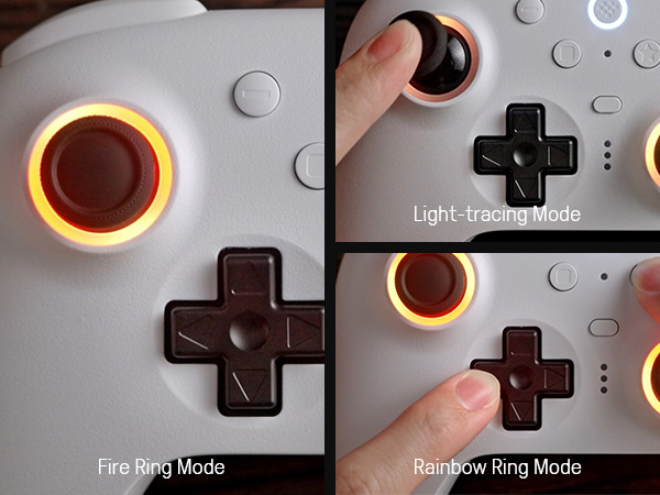 Enhance your gaming experience with multiple RGB light modes on the joysticks including Fire Ring, Light-tracing, and Rainbow Ring.