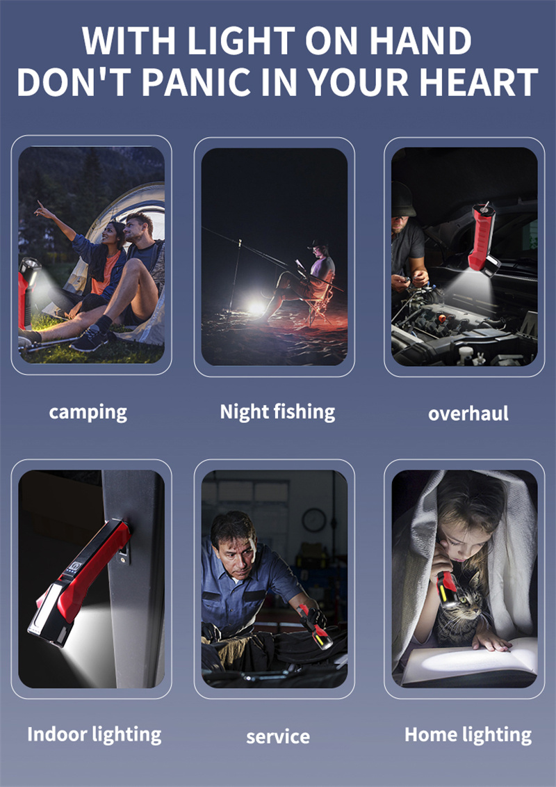 5.The LED work light is a perfect tool for camping, hiking, travelling, reading, workshop, car repair, emergency and home use etc.