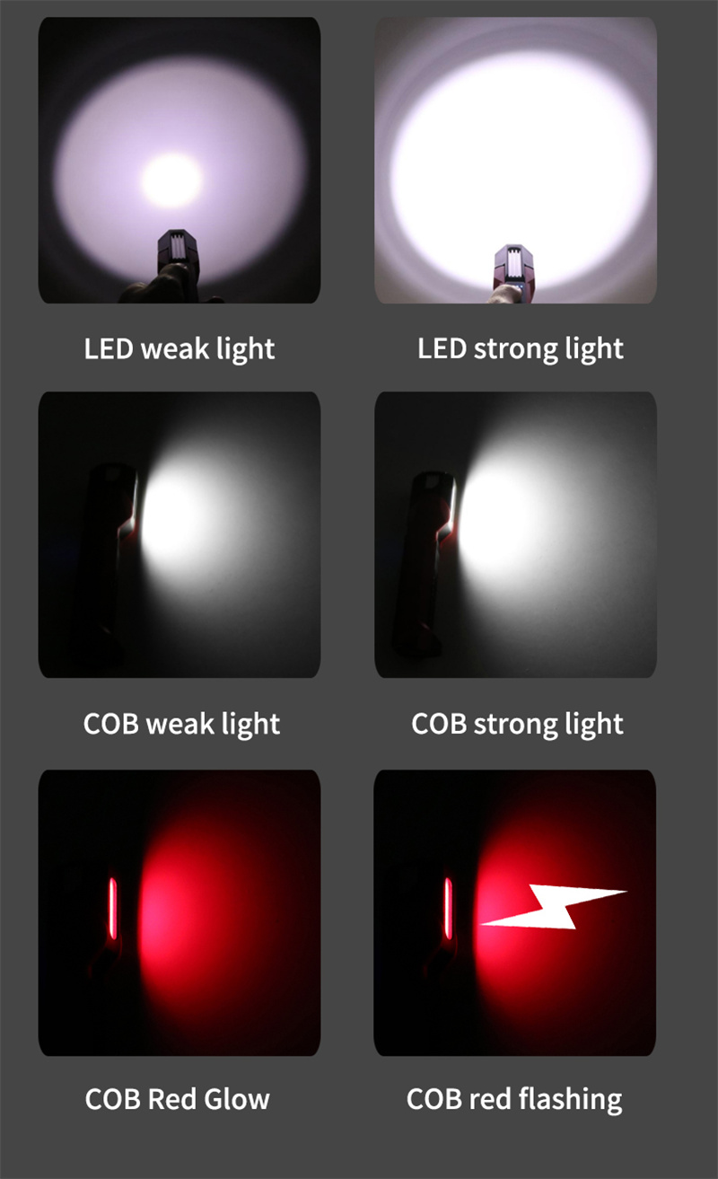 LED Weak Light - LED Strong light - COB Weak Light - COB strong Light - Long Press COB Red Light - COB Red Light Flashes