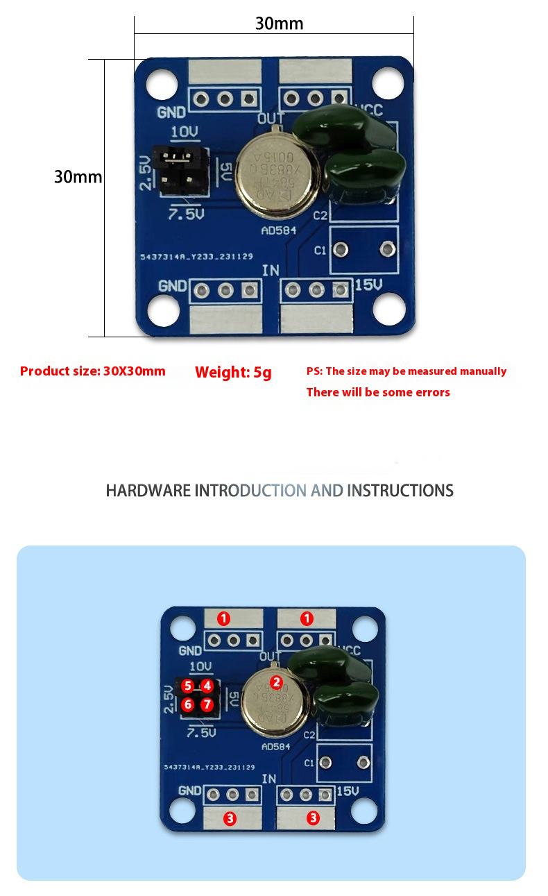 The voltage reference module is developed based on AD584TH/88B3, with an input voltage of 12V-15V. By connecting different pin headers through jumper caps, it can output high-precision voltages of 2.5V, 5V, 7.5V, and 10V respectively. This module can help users provide accurate voltage support during product development.