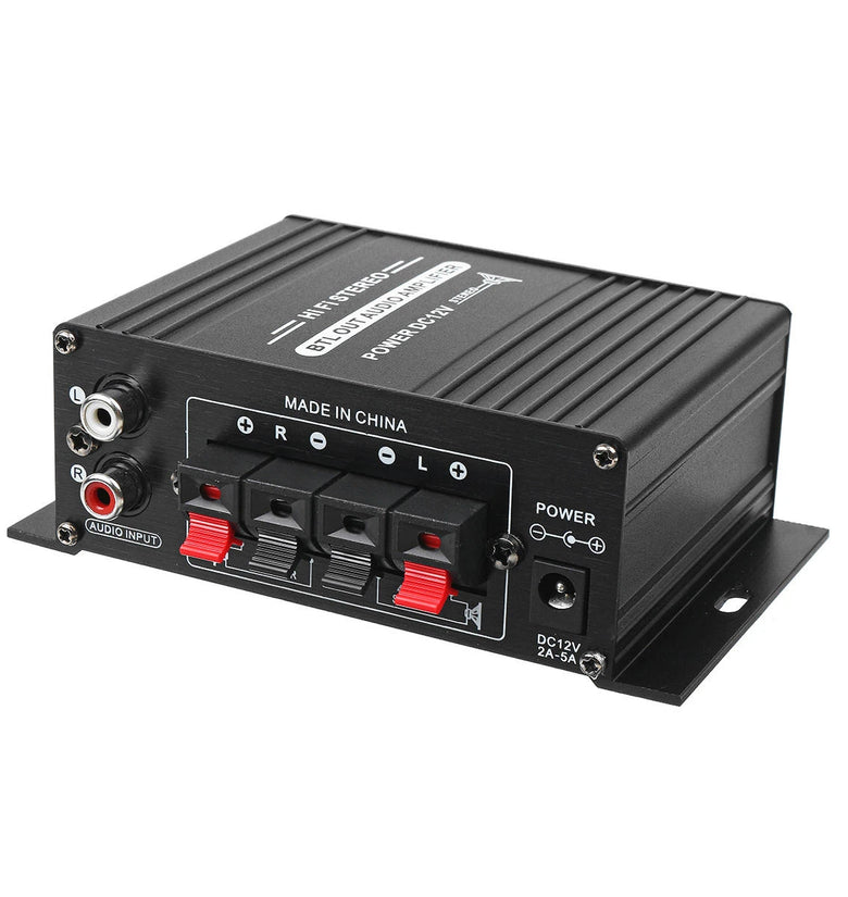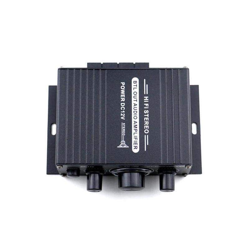 Specifications: Model: AK170 Color: Black Material: Aluminum Alloy Size: about 125X75X40MM Input voltage: DC 12V RMS power: 20W+20W Max power: 200W+200W Channel: 2CH Load impedance: 4-16Ω SNR: >90 db Frequency: 20Hz-20KHz Distortion rate: 0.01%