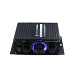 Features: - Mini HIFI audio power amplifier. - Aluminum Alloy Body, Large knobs are designed with blueLED lights tomake the products morebeautiful and beautiful. - Low distortion supplies a clearer, stronger and more powerful sound. - Two main channel output