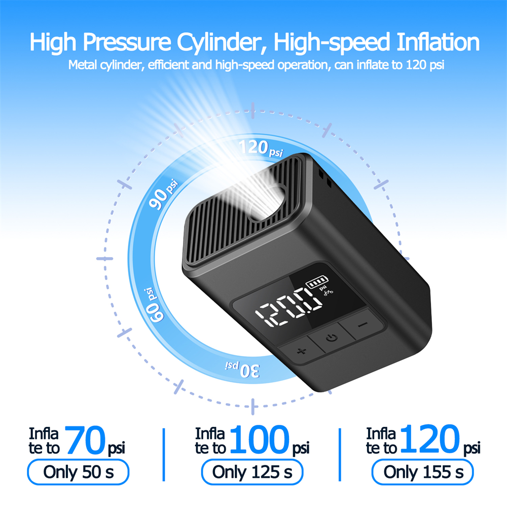 1. Fast Inflation: Fill a tire from 0-120 psi in 155 seconds powered by a 60W brushless motor.