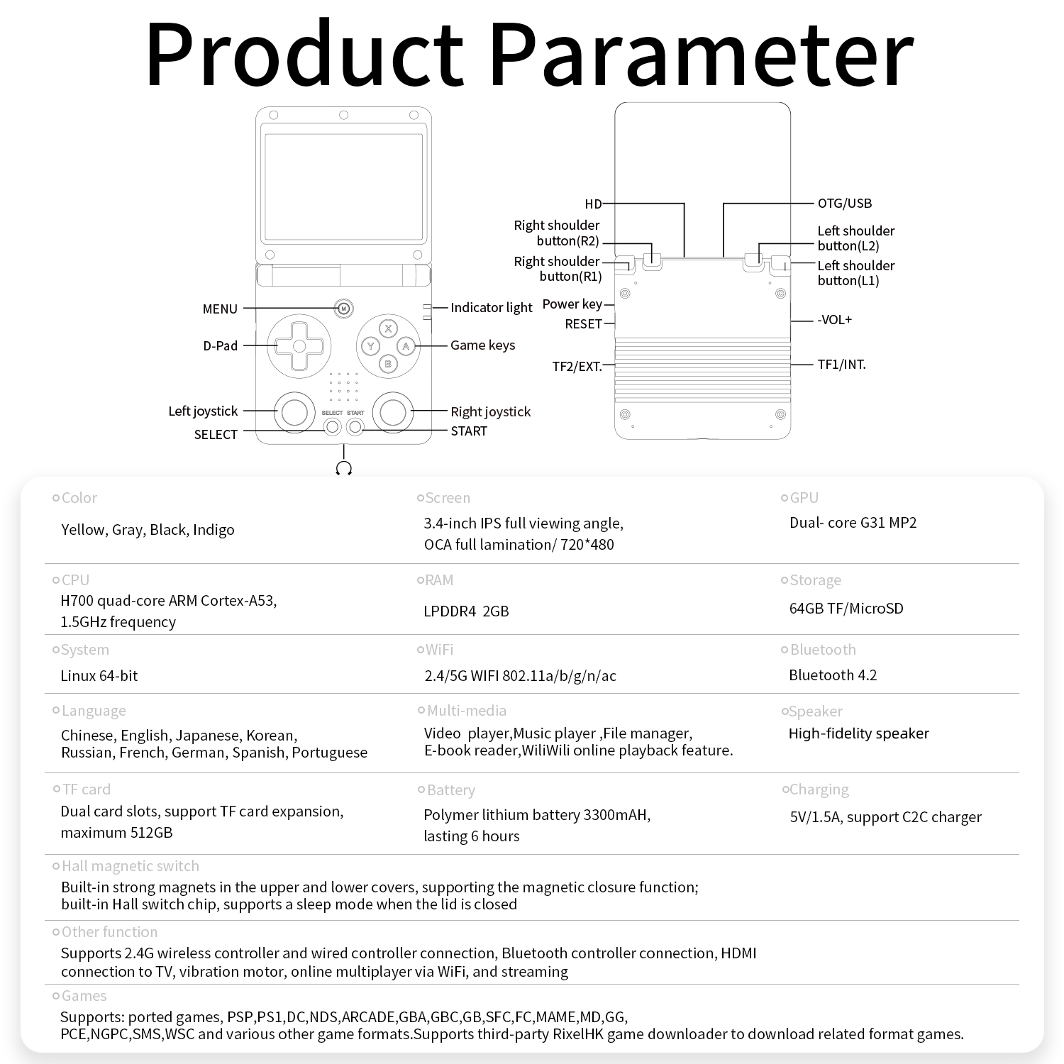 | Games | Supports third-party software, RixelHK (Game Downloader) Supports: ported games, for PSP,PS1,DC,NDS,ARCADE,GBA,GBC,GB,SFC,FC,MAME,MD,for GG, PCE,NGPC,SMS,WSC and various other game formats. Support users to download related format games.' |