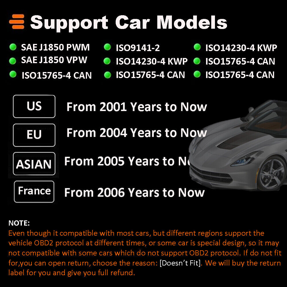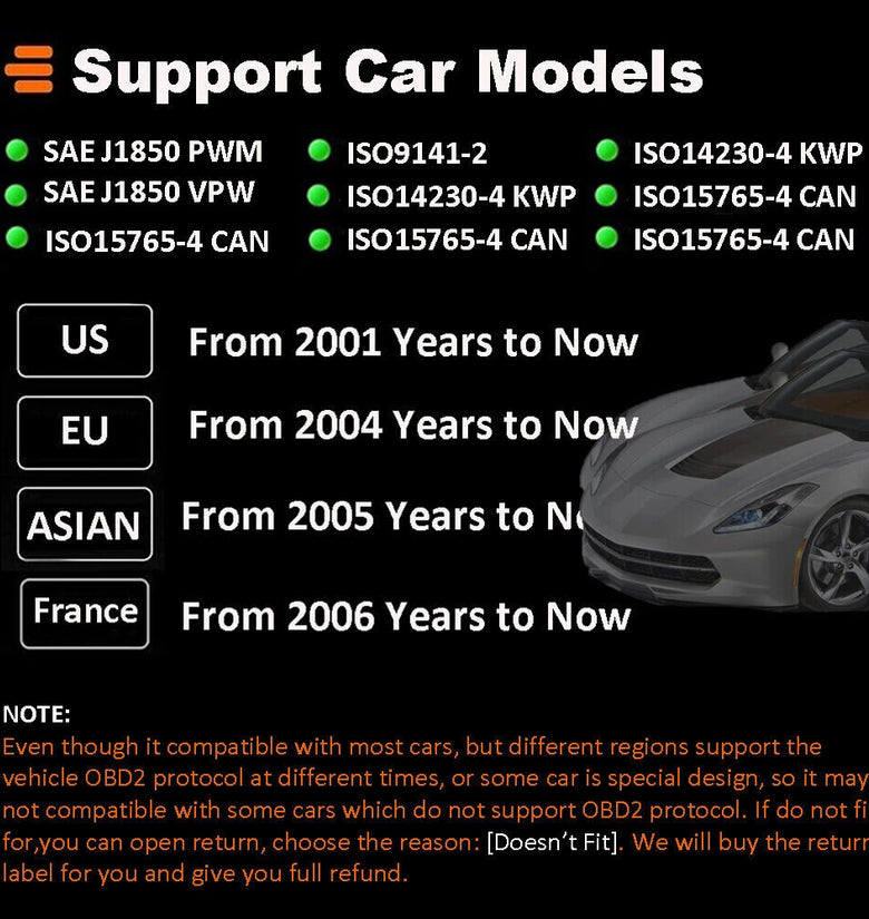 USA car list: Standard obd2 is required, and the release year is from 2001 to present Suitable for Chrysler/Ford/GM/Jeep/ Lincoln/Buick/Cadillac/Chevrolet/Dodge/HM, etc... Japanese/Korean car list: Standard obd2 required, release year from 2006 to present Suitable for Honda/Acura/Toyota/Scion/Lexus/Mazda/Nissan/Infiniti/Isuzu/Daihatsu/Suzuki/Mitsubishi/Subaru/Samsung/Daewoo/Hyundai, Kia, etc...