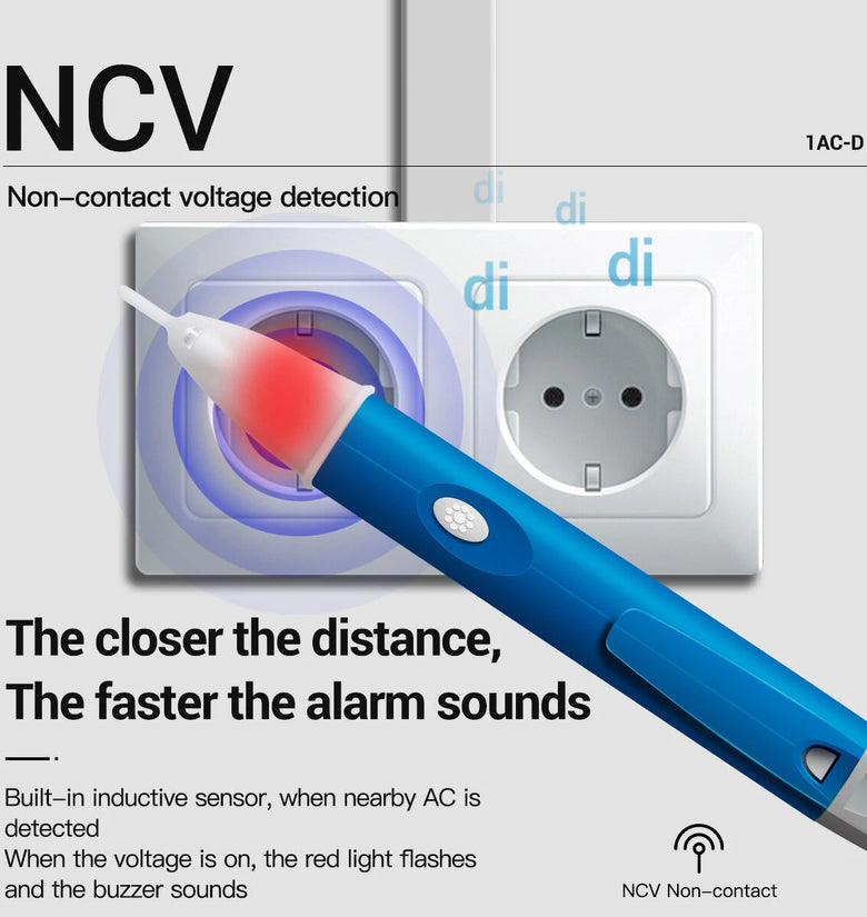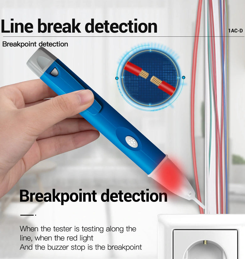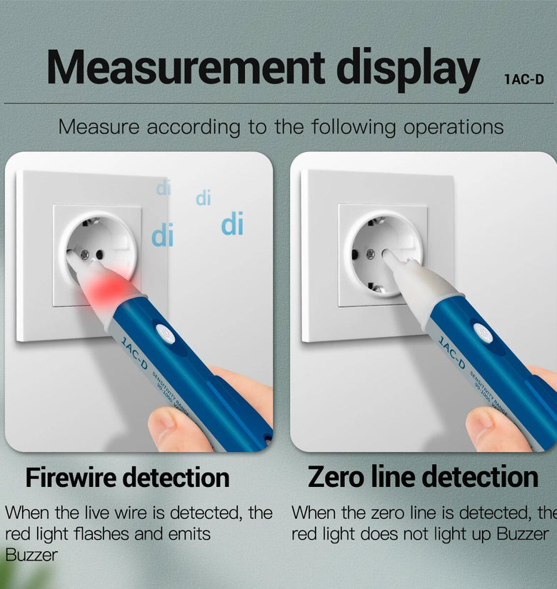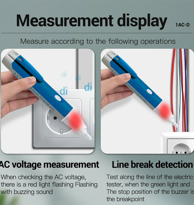 The next generation AC non-contact voltage tester is easy to use-just touch the tip to the terminal block, socket or power cord. When the pen tip glows red and the device beeps, you know that there is voltage. Electricians, maintenance, service, security personnel, and homeowners can quickly test energized circuits in the workplace or home. The perfect tool kit for home and power industry. Ideal design for testing power cords, circuit breakers, wall sockets, junction boxes, fuses, etc. Just press a button. When there is no voltage, the white LED light can always be on. And the red flashing LED indicates that the voltage is completely insulated, no exposed metal or conductive parts, long life, low power consumption, compact, safe and easy to carry.