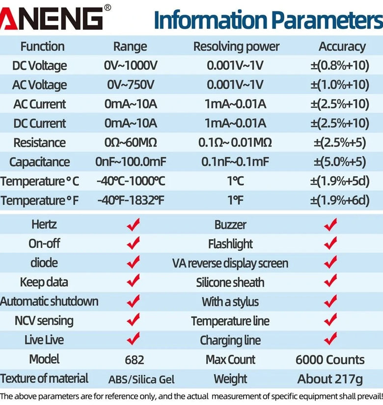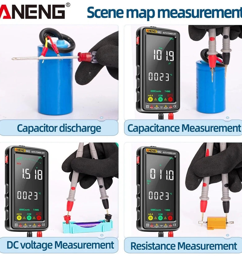 682 is a 6000 count pocket type true effective value automatic scanning digital meter.682 automatically recognizes and measures according to the different input voltage/current/resistance/etc. signals.682 has the characteristics of stable performance, high precision and clear reading.682 also has additional convenient functions of flashlight test.682 is an ideal tool and instrument suitable for factories, teaching and electronic enthusiasts.