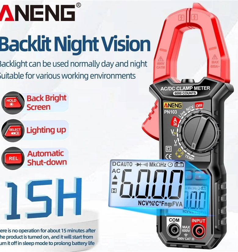 ANENG PN103 AC/DC Current Clamp Meter 6000 Counts True RMS Digital Multimeter 600A Clamp Meter