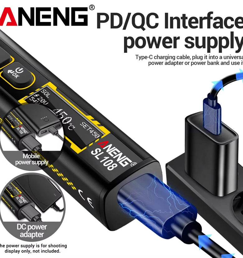 The soldering iron can be powered by a universal power adapter or a power bank, making it versatile for both indoor and outdoor use. It also has an integrated lithium polymer battery for emergency situations.