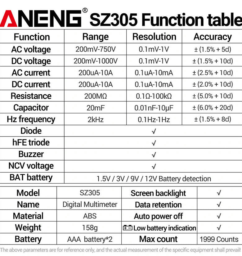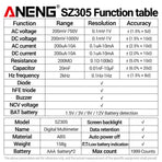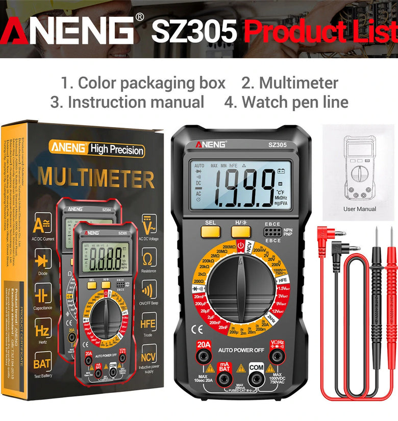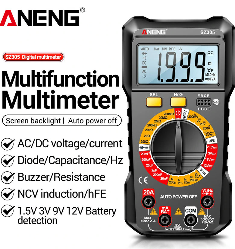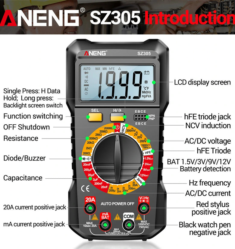 mso-bidi-font-family:'Times New Roman';font-size:10.5000pt;mso-font-kerning:1.0000pt;'>Comprehensive Measurement Capabilities: The ANENG SZ305 Digital Multimeter is a robust device capable of measuring AC/DC voltage, AC/DC current, resistance, capacitance, and frequency, ensuring a wide range of electrical testing possibilities.mso-bidi-font-family:'Times New Roman';font-size:10.5000pt;mso-font-kerning:1.0000pt;'>