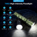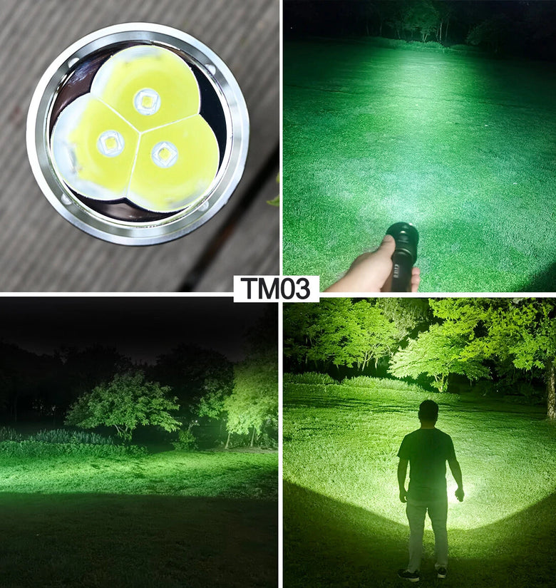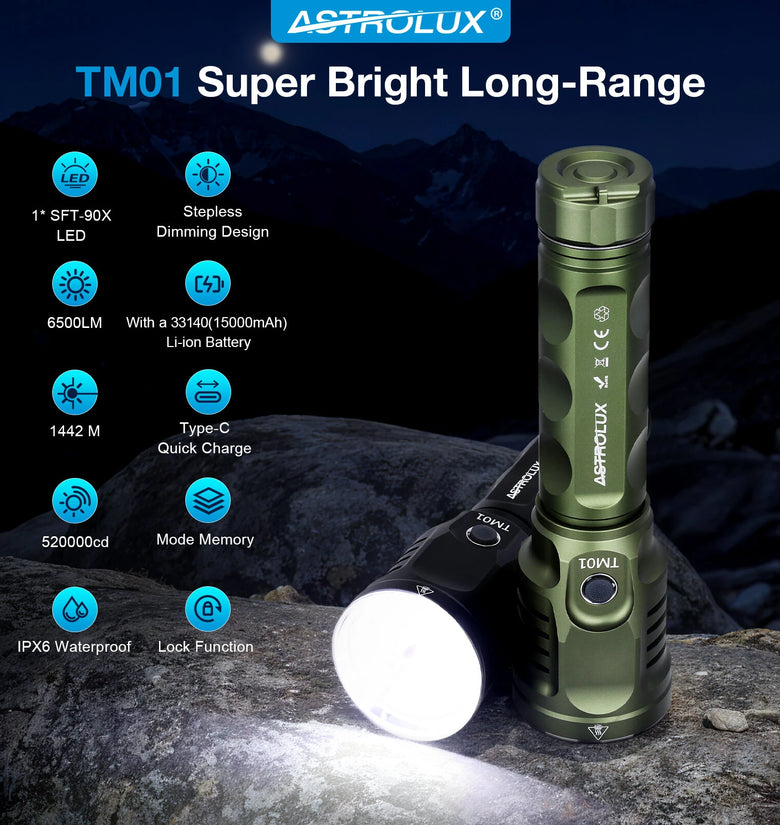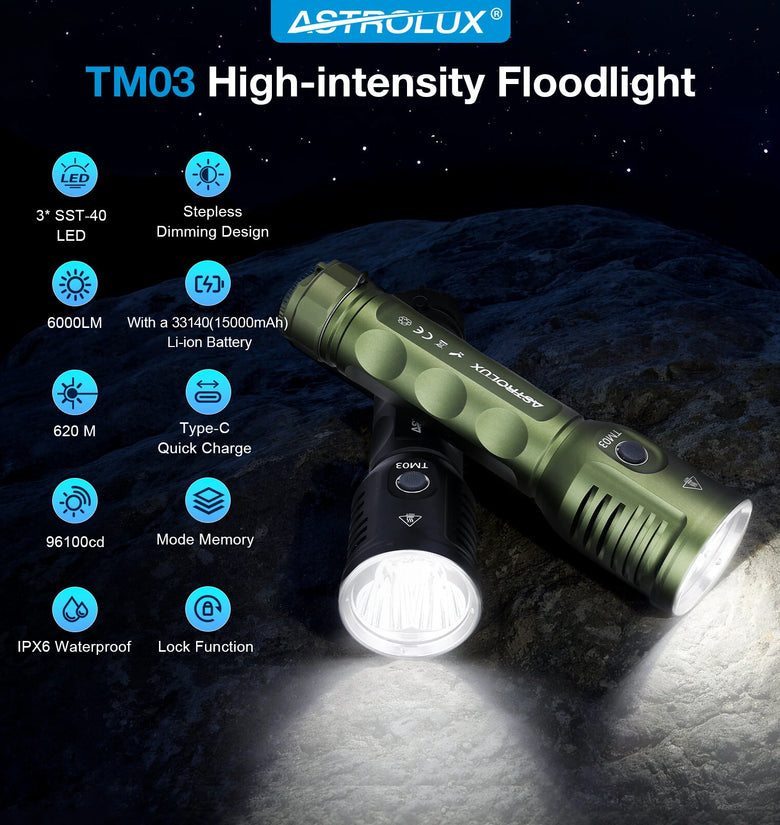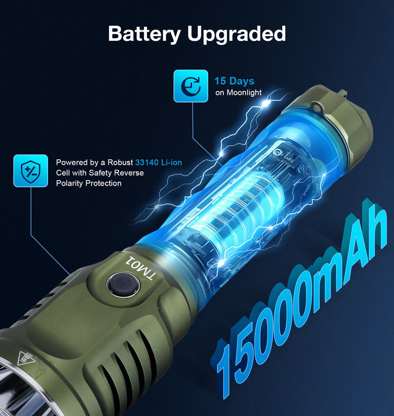 By the way, TM01 and TM03 share elite engineering:- Industrial 33140 Battery (15,000mAh)|15-day moonlight runtime / hours on turbo-Aerospace Aluminum Body|IPX6 waterproof & shockproof (survives rainstorms and 1m drops)-Smart Illumination System|Flicker-free dimming (Moonlight → Turbo → Strobe) +Thermal regulation