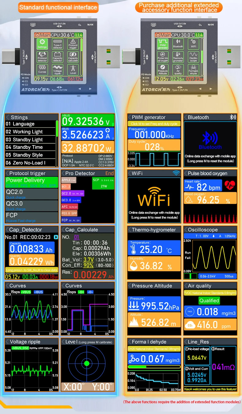 Fast Charging Automatic Scanning Protocols Supported: APPLE, SS2P0, BC1P2, TYC, QC2A, QC2B, QC3A, QC3B, AFC, FCP, SCP, HISCIP, VOOC, SVOOC, VOOC3.0, VOOC4.0, VIVO, VOO2(Z3 27W), VOO3(IQOO 44W), MTK, PPS, PD3/PD2