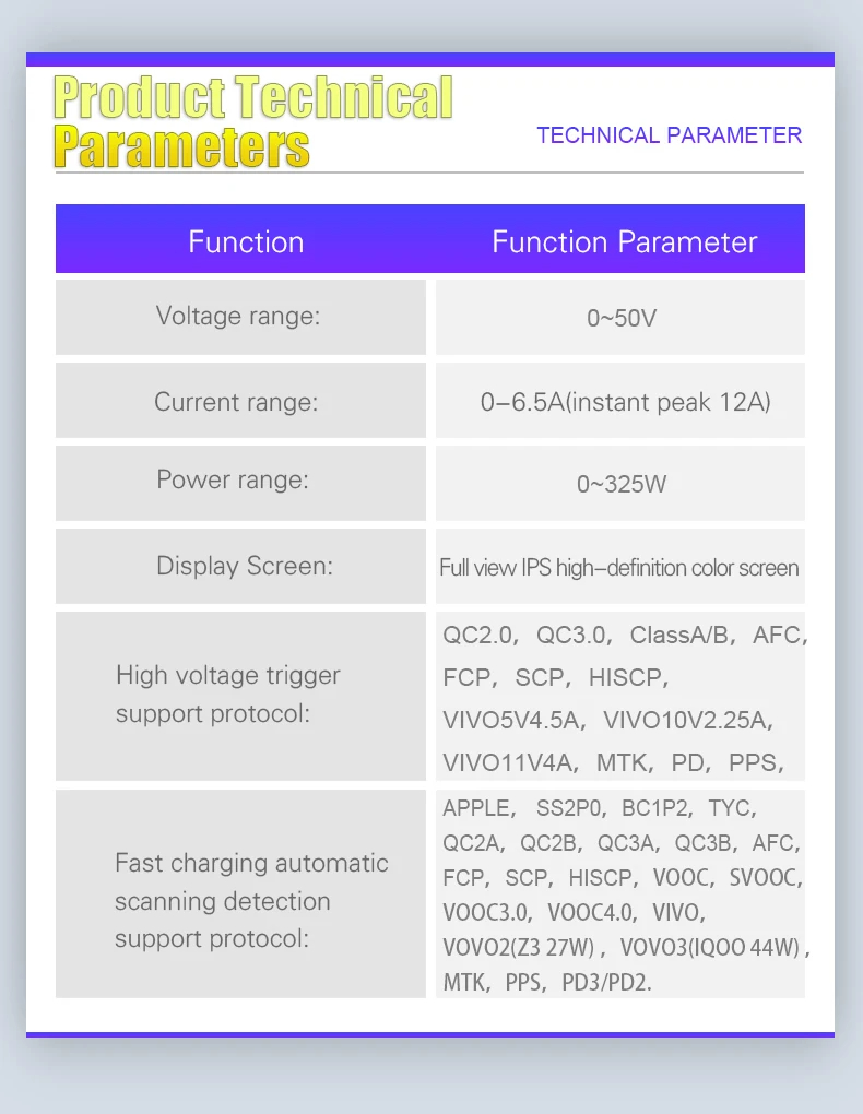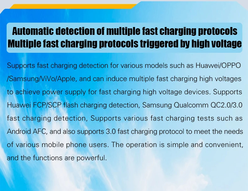 1. Comprehensive Protocol Compatibility: Supports a wide range of high-voltage trigger and fast charging automatic scanning protocols, ensuring compatibility with major brands and diverse charging standards.