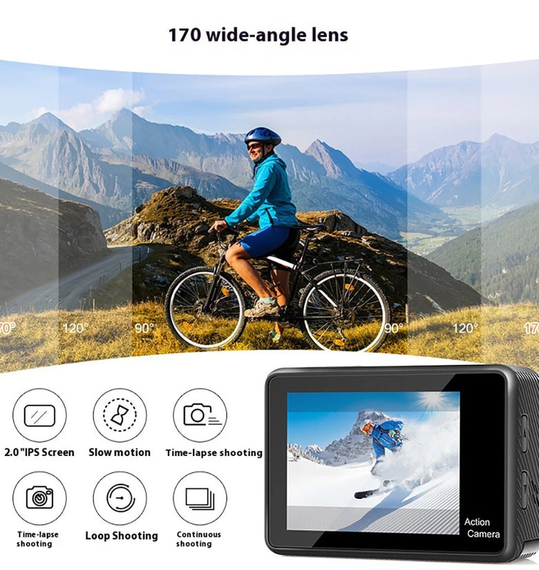 - 170° Ultra-Wide-Angle Lens: Equipped with a 170-degree wide-angle lens, this action camera allows you to capture more of the surroundings in your footage. Perfect for expansive landscapes or action sports, this lens ensures nothing is left out of the frame.