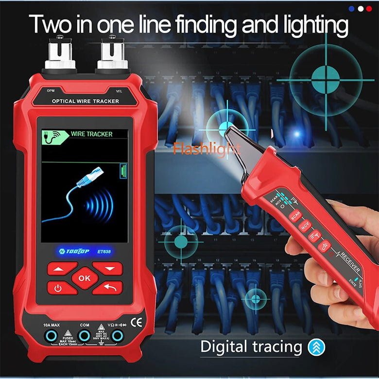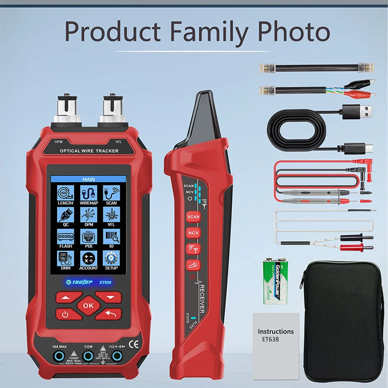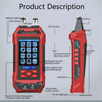 Features:Versatile Cable Testing: Test various cable types including network cables (600M), telephone lines (400M), and coaxial cables (400M), ensuring comprehensive connectivity checks.High-Resolution Display: Equipped with a 3.2 inch 240*320 dot matrix color screen, presenting clear, detailed data for easy interpretation and troubleshooting.Advanced Multipurpose Functions: Includes DMM with high precision (60000COUNT), capable of measuring DCV, ACV, DCA, ACA, resistance, capacitance, frequency (Hz), continuity, diodes, and fuses.