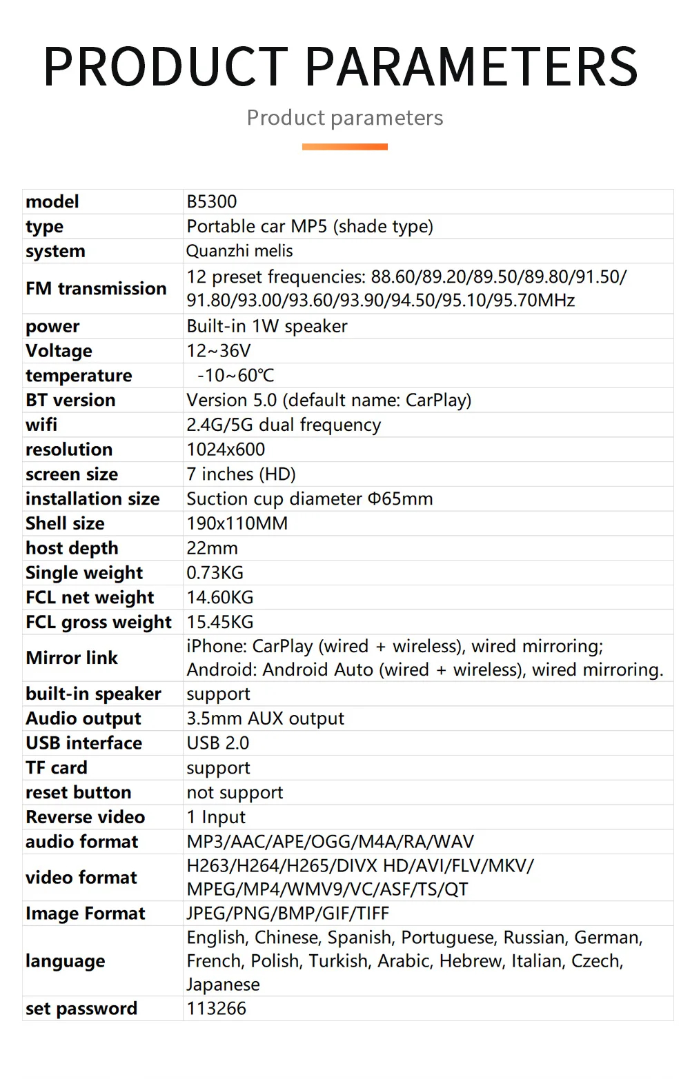 wifi frequency:2.4G/5G dual frequency(It is only used to connect car play and Android auto)