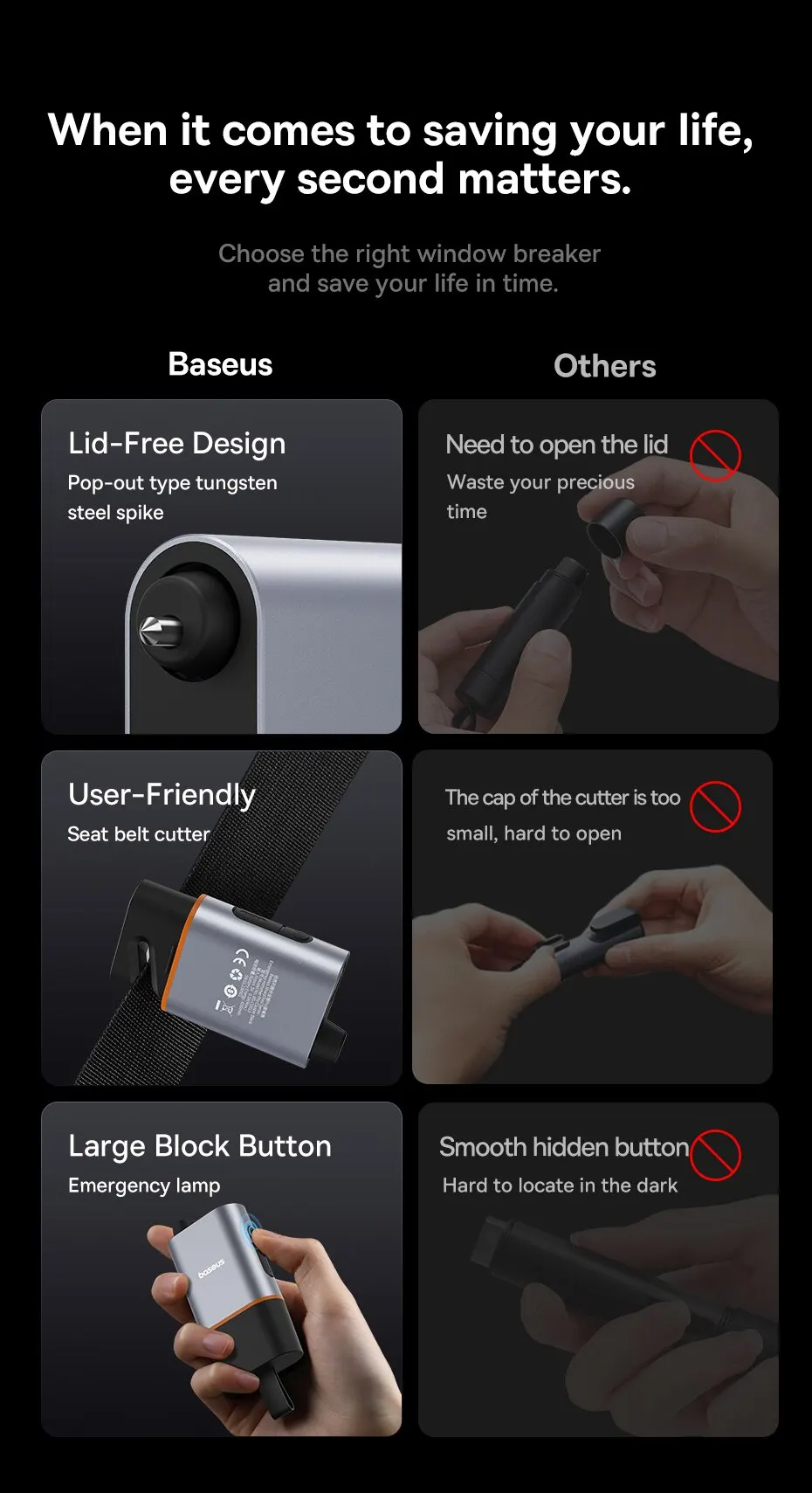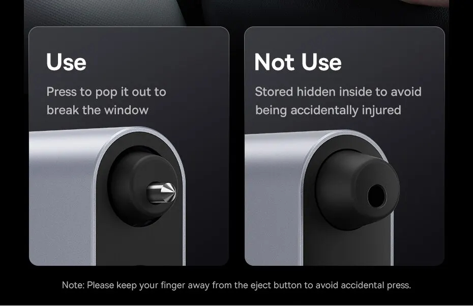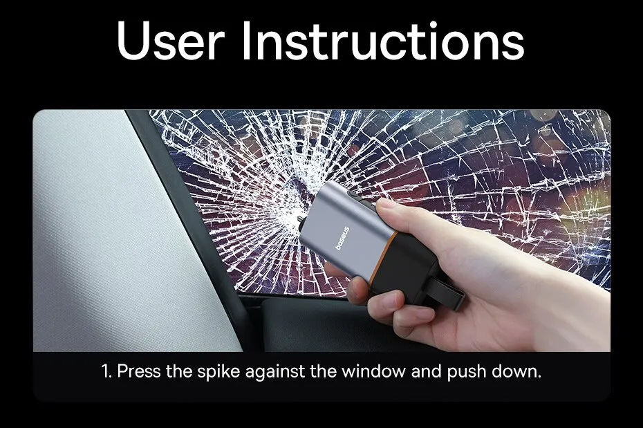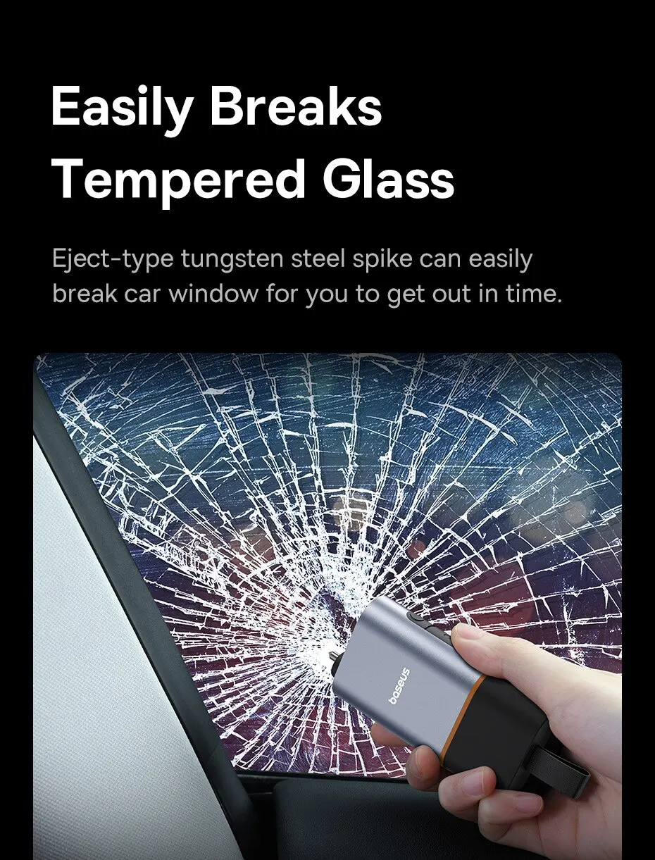 1. Effortless Window Breaking: Equipped with a sharp U-shaped head of hammer made of premium aluminum alloy, this device can swiftly shatter car windows during emergencies, offering an effective escape route in critical scenarios.