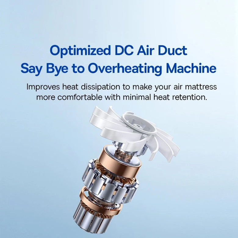 - Optimized DC Air Duct for Fast Heat Dissipation: Featuring an optimized DC air duct design, this inflatable pump significantly improves heat dissipation compared to previous models. This ensures the air mattress and the pump itself remain cool during inflation, providing a more comfortable and safe experience.