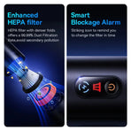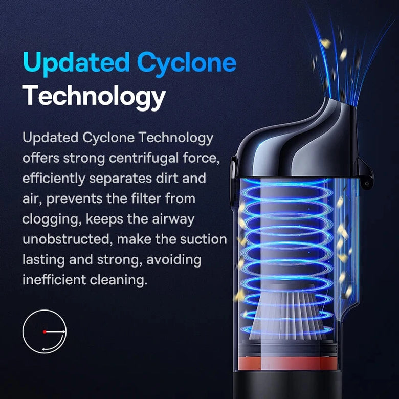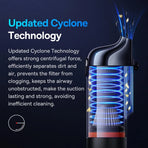Updated Cyclone Technology offers strong centrifugal force, efficiently separates dirt and air, prevents the filter from clogging, keeps the airway unobstructed. And the suction performance will last without loss; has strong suction, ensuring long-lasting and excellent vacuuming performance and avoiding inefficient cleaning.