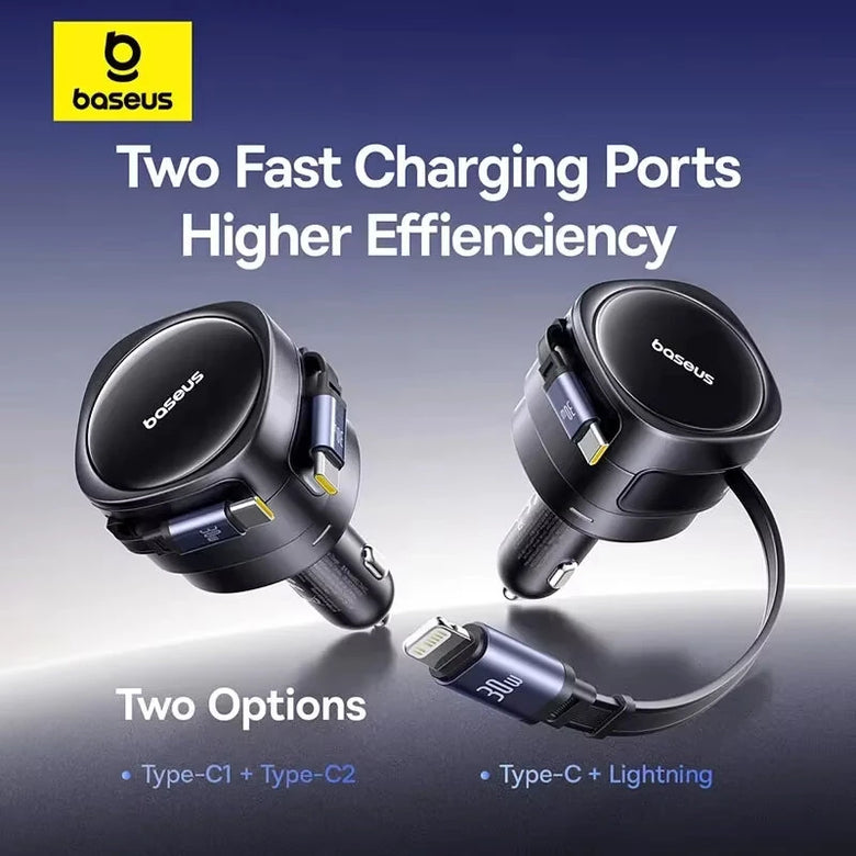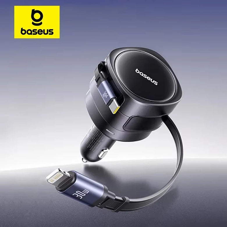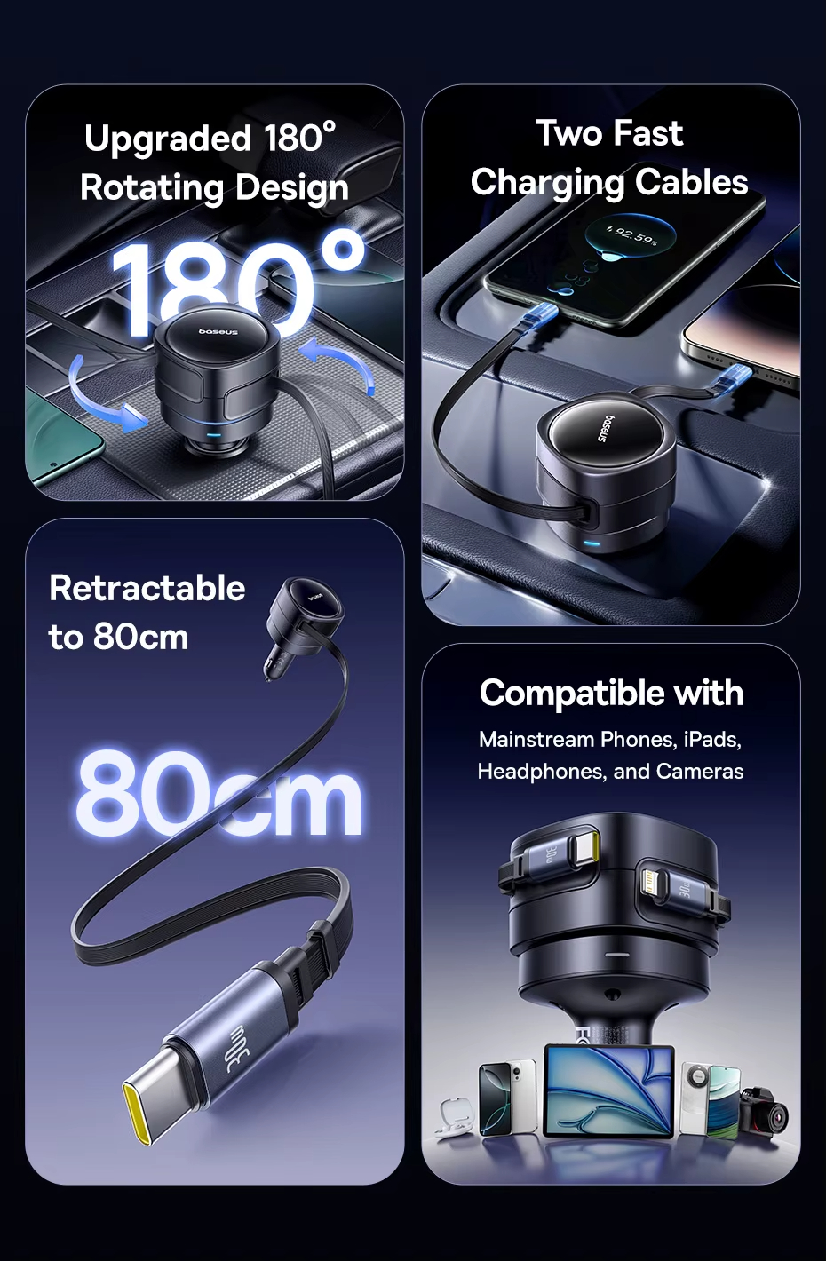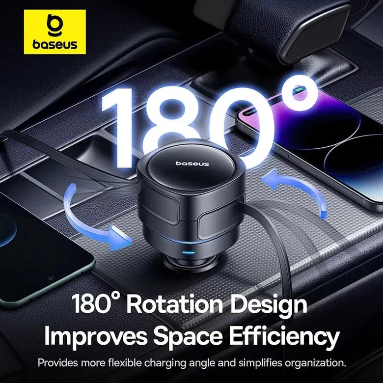• Baseus Car Charger Dual Retractable Cable PD QC SCP AFC PPS Fast Charging 180 Rotating For Tablet for iPhone for Samsung Huawei Xiaomi