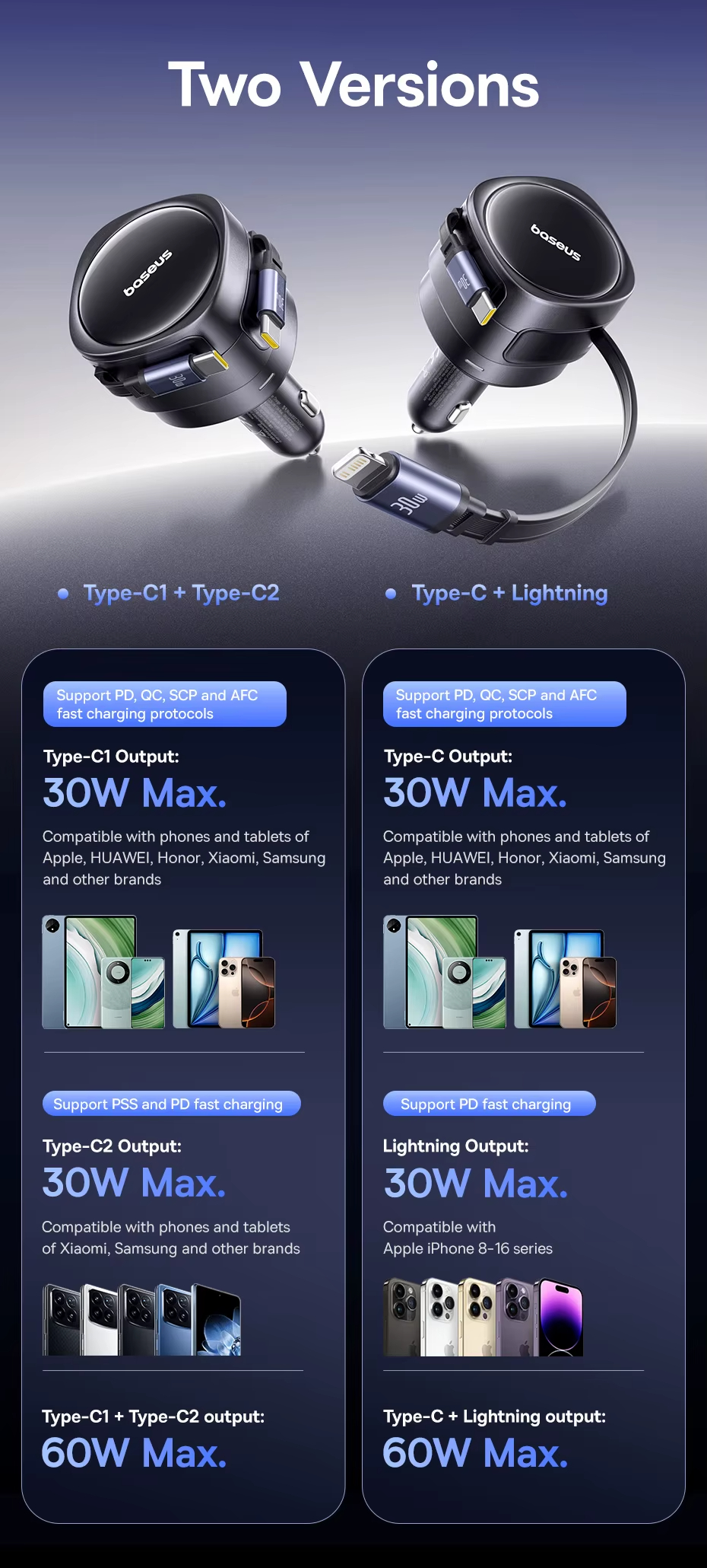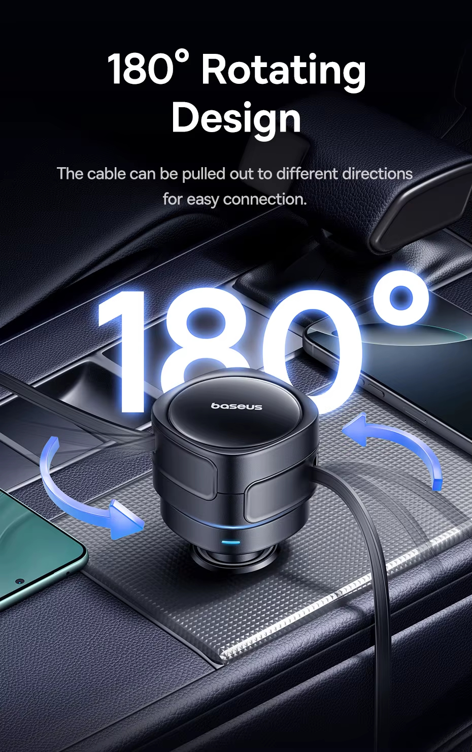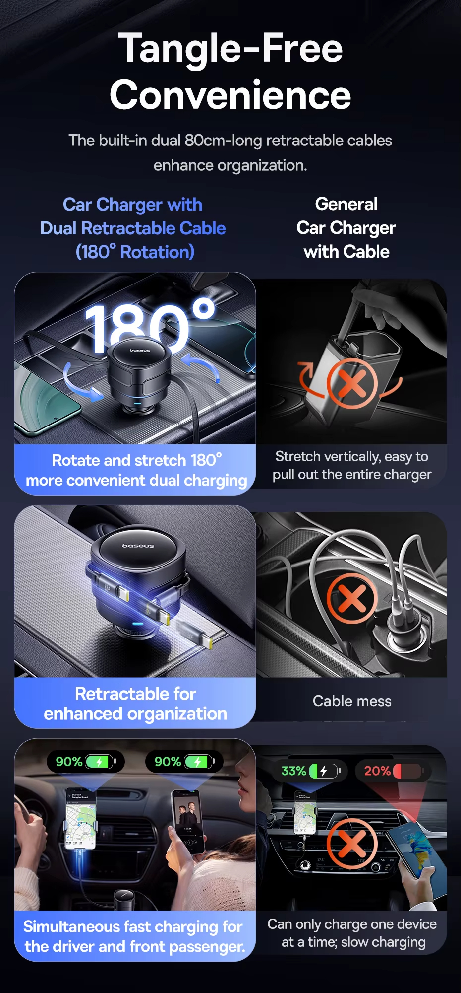 • Baseus Car Charger Dual Retractable Cable PD QC SCP AFC PPS Fast Charging 180 Rotating For Tablet for iPhone for Samsung Huawei Xiaomi