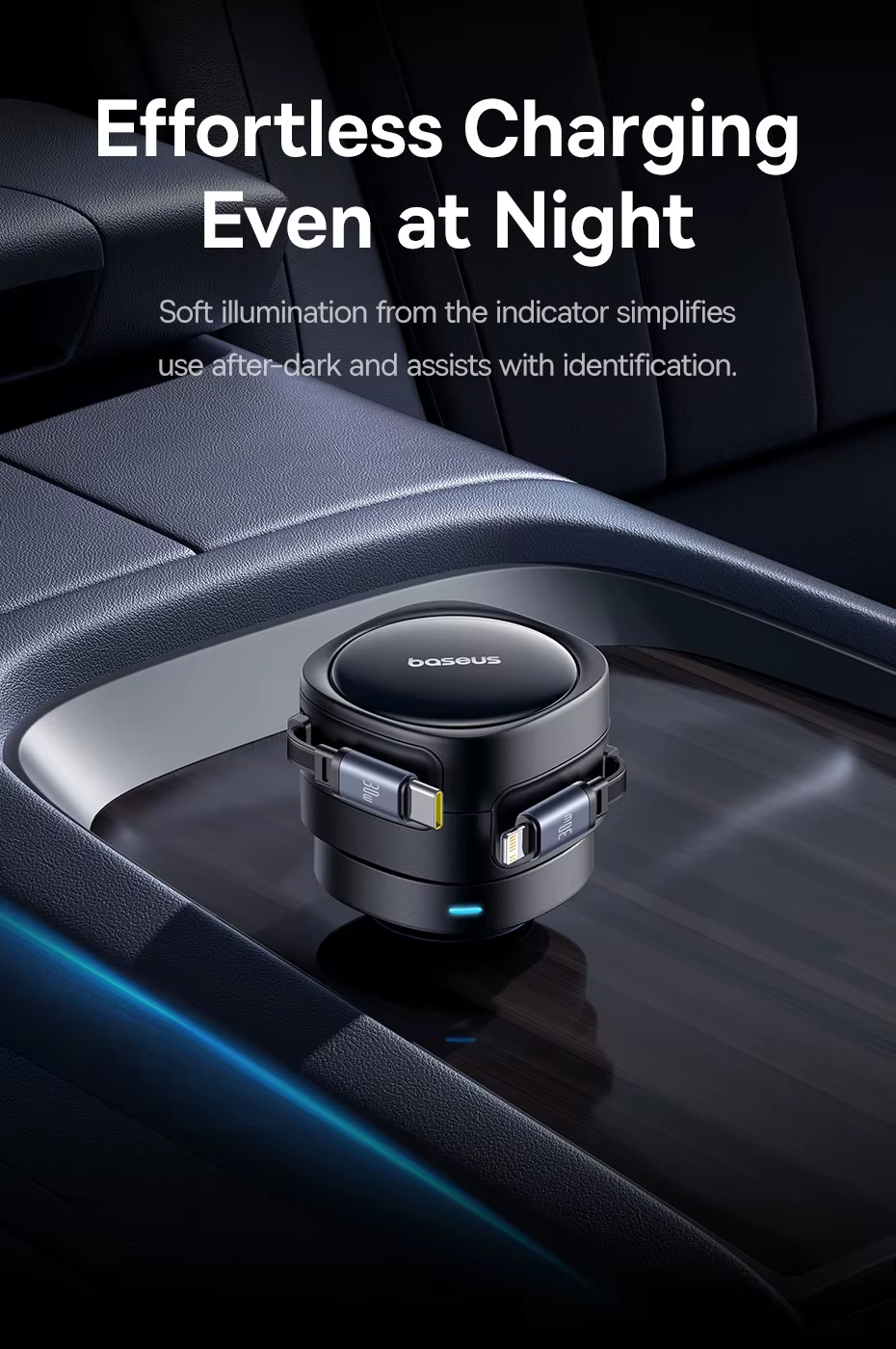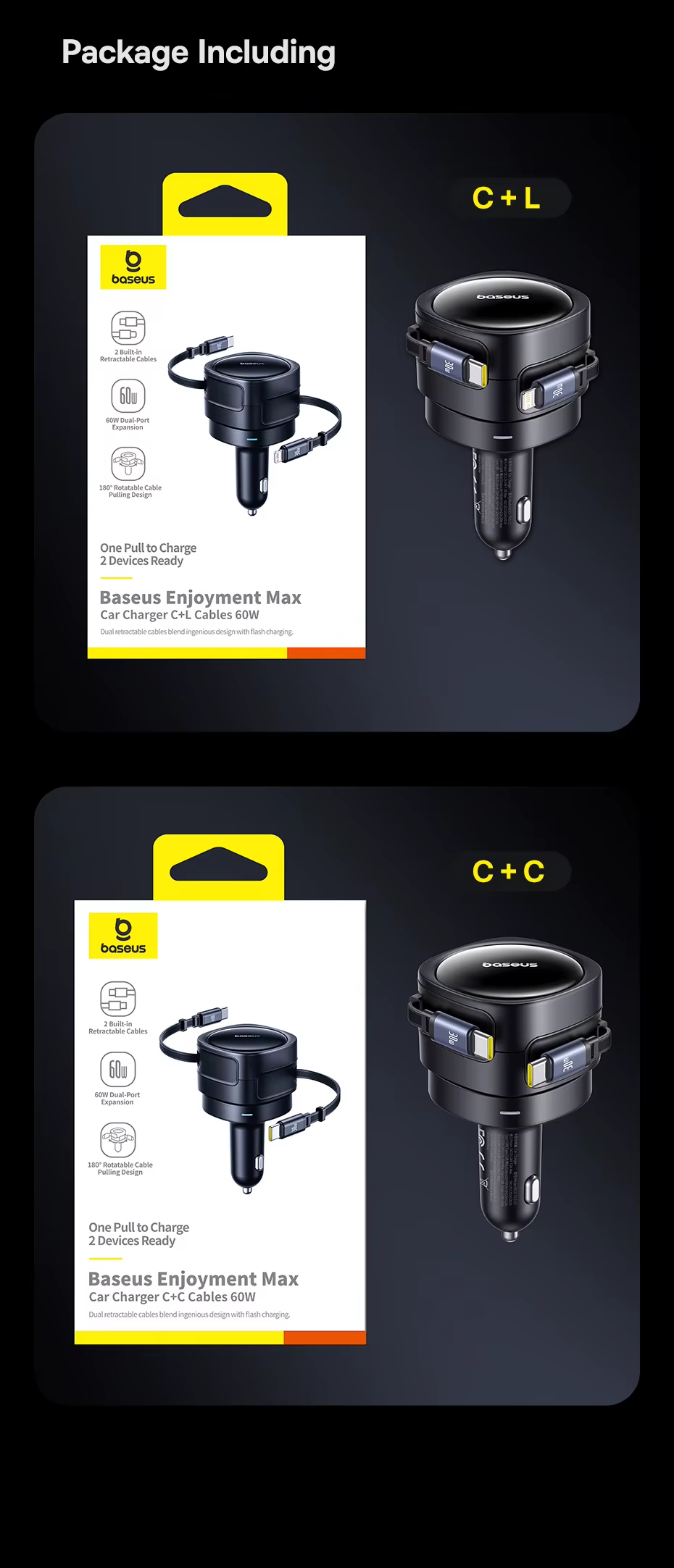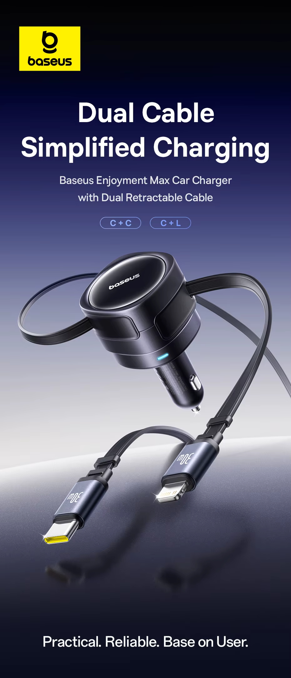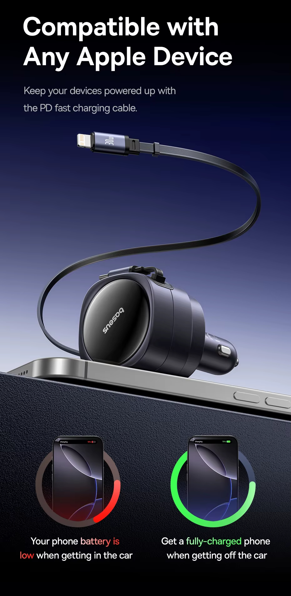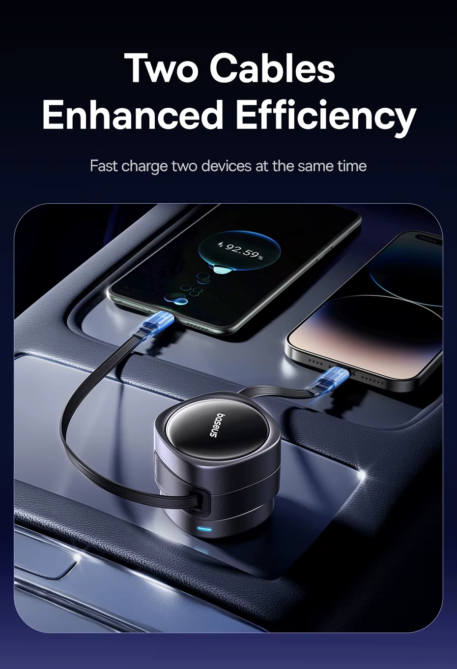 - Retractable Cables for Organization: Equipped with dual 80cm retractable cables, this car charger enhances neatness. Say goodbye to cable mess, as it provides an organized and clutter-free charging environment inside your vehicle.