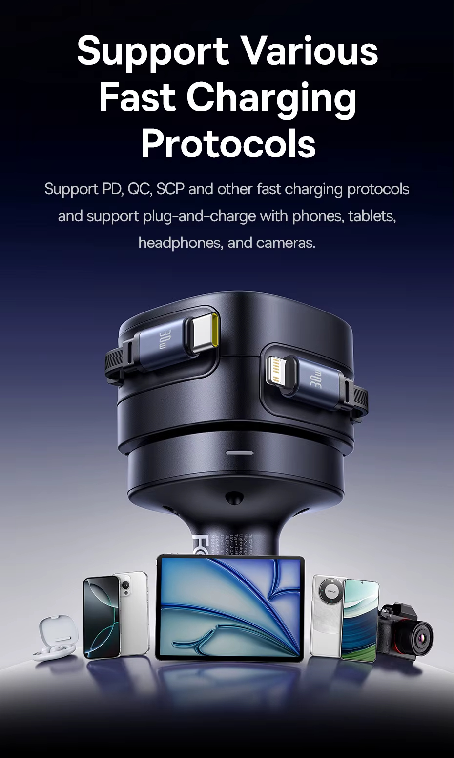 - Multiple Fast Charging Protocols: Supports PD, QC, SCP, AFC, and more fast charging protocols. Compatible with a variety of devices including smartphones, tablets, cameras, and headphones, ensuring rapid and reliable charging.