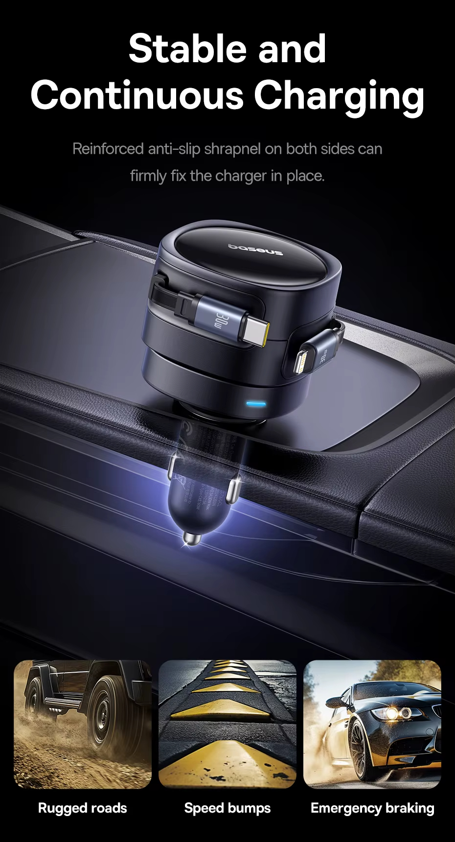 - Stable and Continuous Charging: Designed to withstand rugged roads, speed bumps, and emergency braking. The reinforced anti-slip slice firmly fixes the charger in place, providing uninterrupted power supply even on bumpy rides.