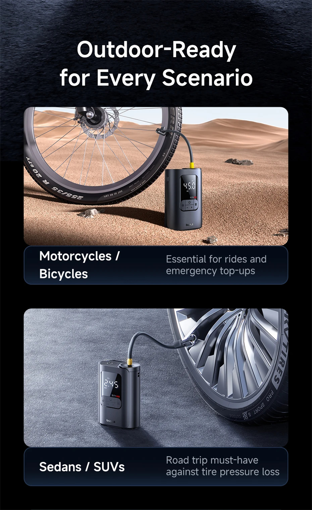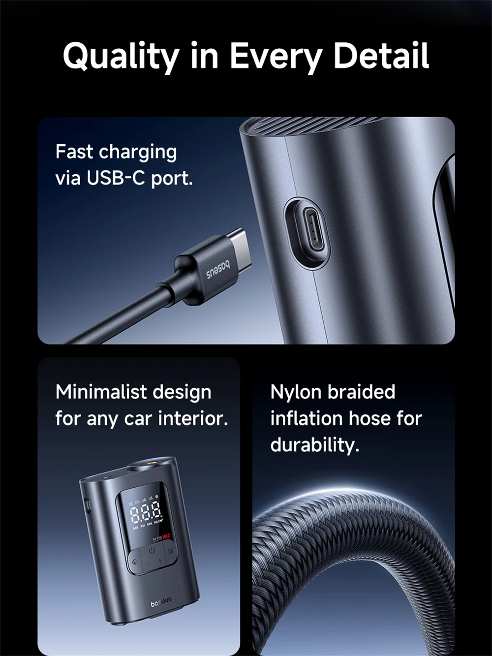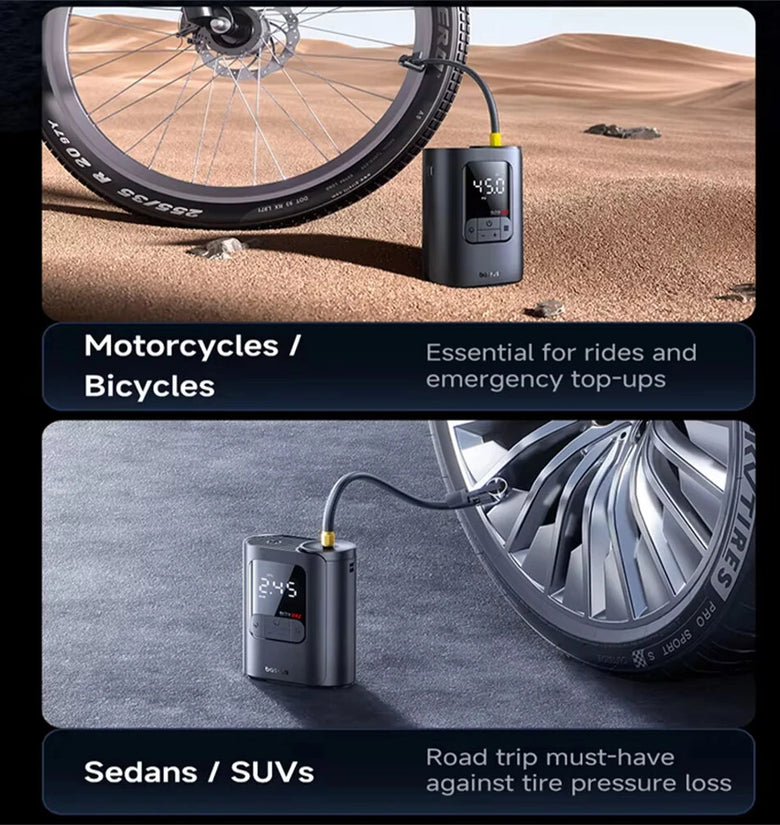 - USB-C rechargeable 5000mAh battery supports inflation of up to 3.6 tires.