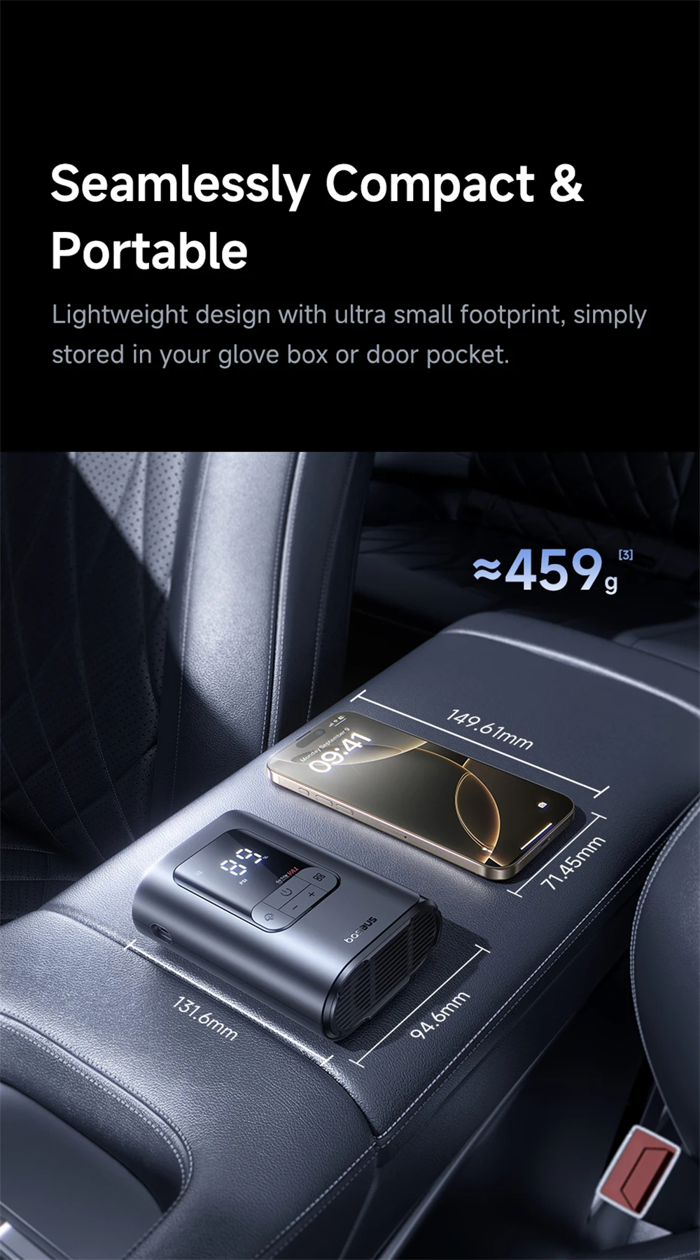 - Compact size easily fits in glove boxes, weighing only 459g.