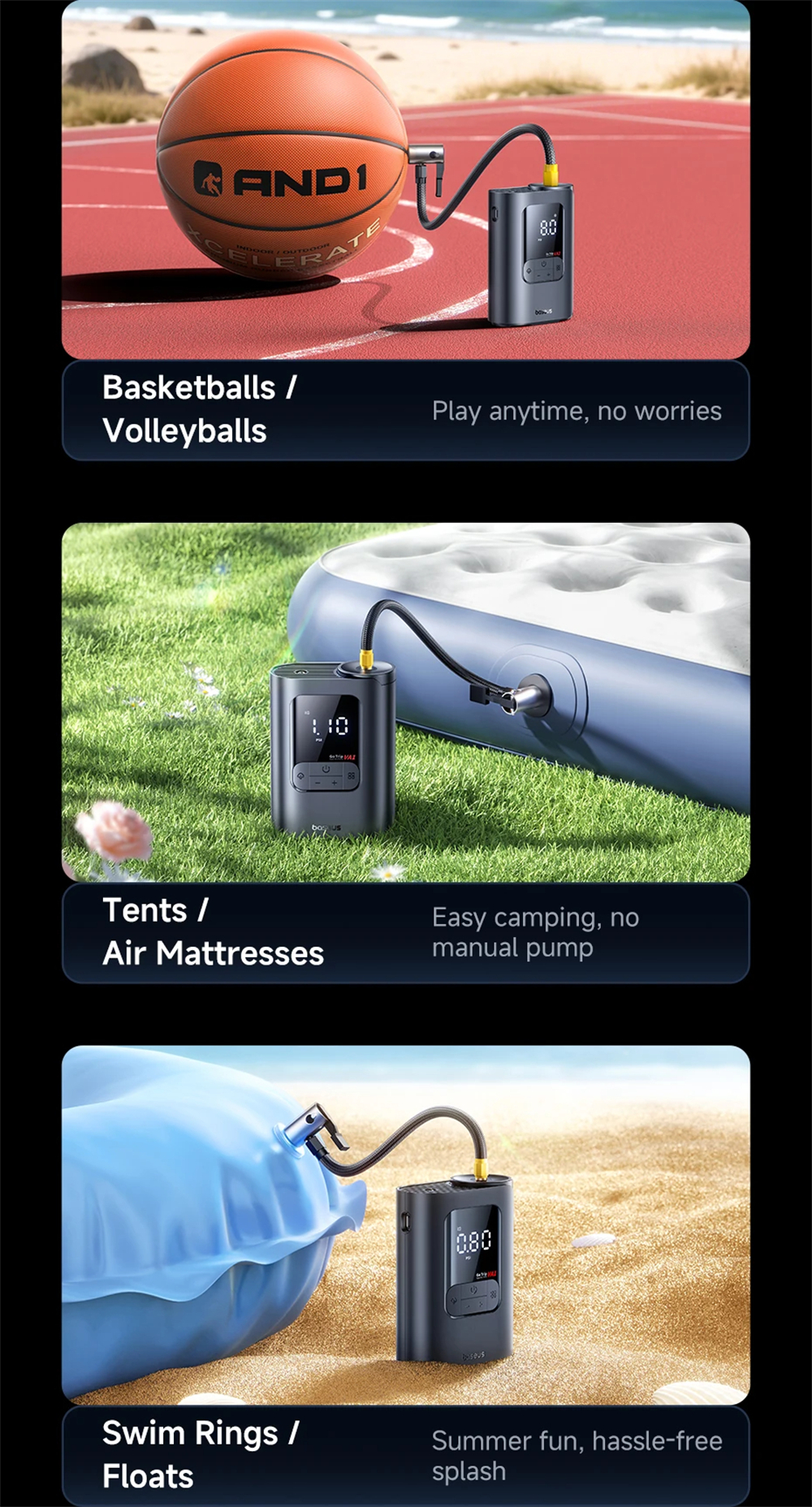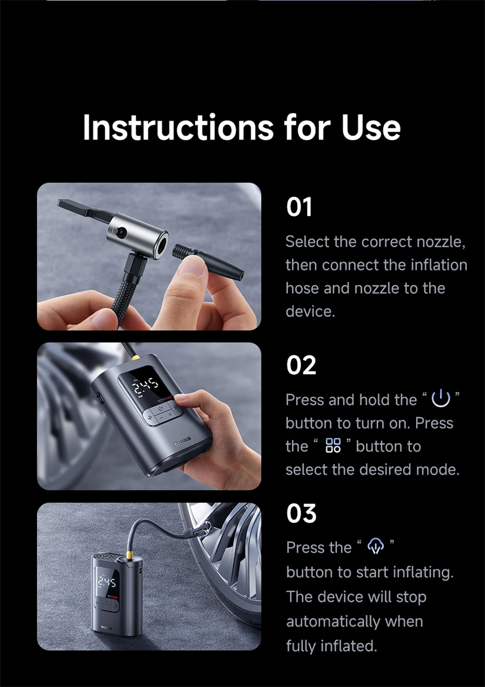 - Five intelligent modes for cars, bikes, balls, and mattresses.