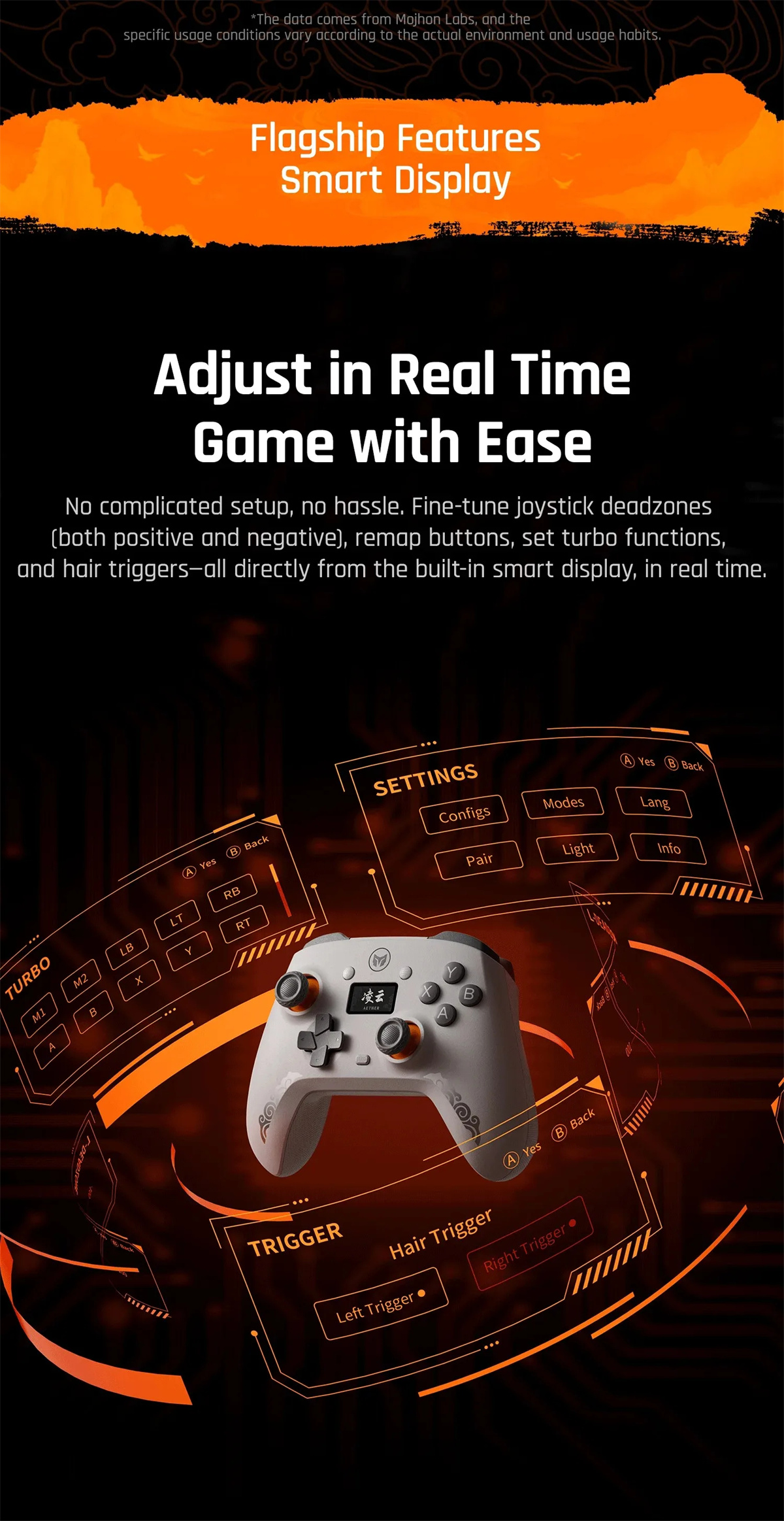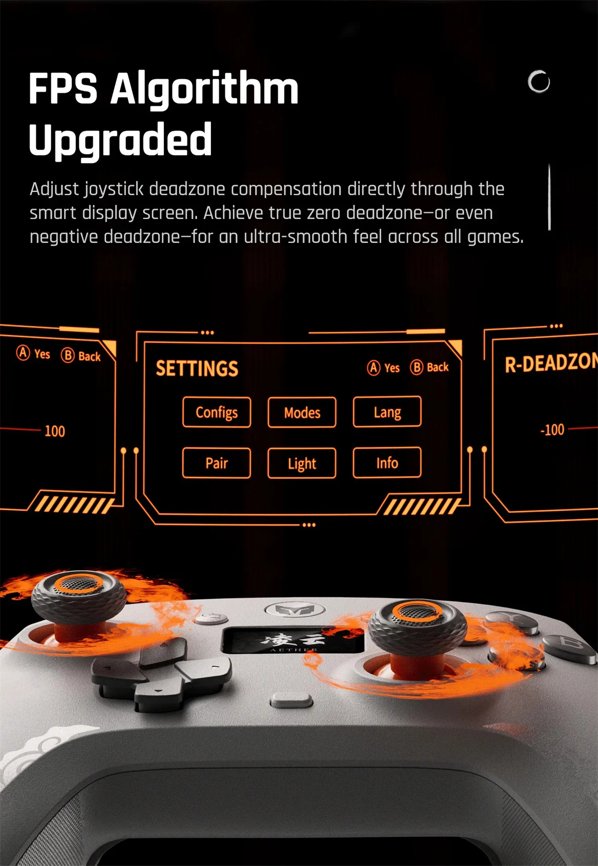 1. Smart Display Integration: Enables on-device adjustments for joystick deadzones, remap buttons, and trigger sensitivity in real time.