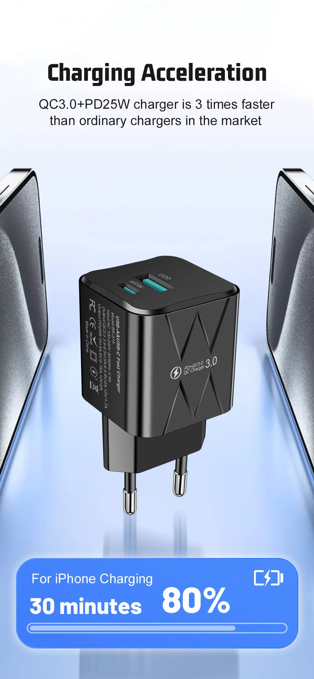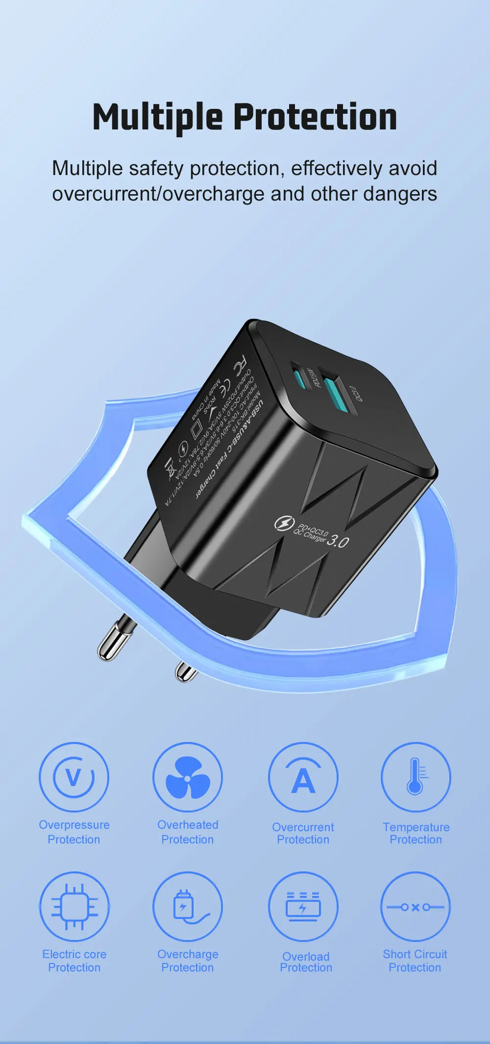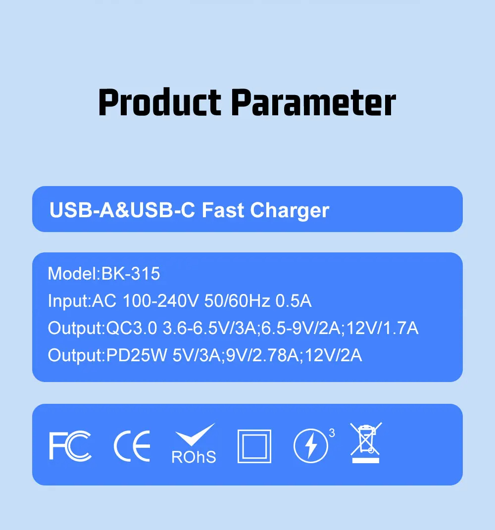 Output | QC3.0 3.6-6.5V/3A;6.5-9V/2A;12V/1.7A PD25W 5V/3A;9V/2.78A;12V/2A |