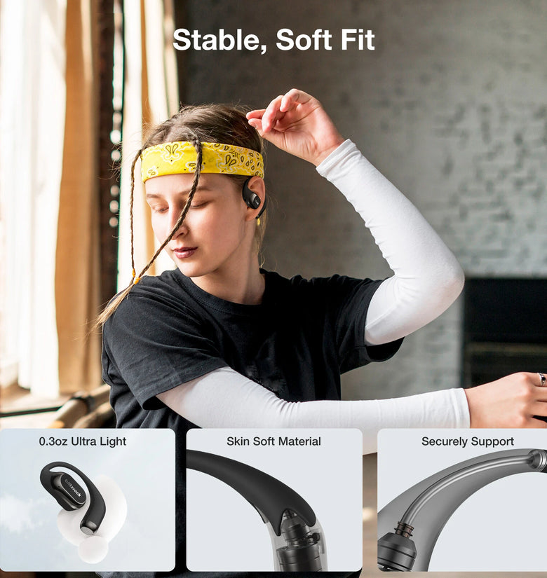 Comfort: The open air earbuds are made from skin-friendly soft silicone and weigh only 0.3oz. Ergonomic zero-pressure design seamlessly fits the natural curve of your ear, ensuring comfort. They ensure a comfortable and secure fit for outdoor running, office work, and home entertainment, so you can enjoy listening with ease