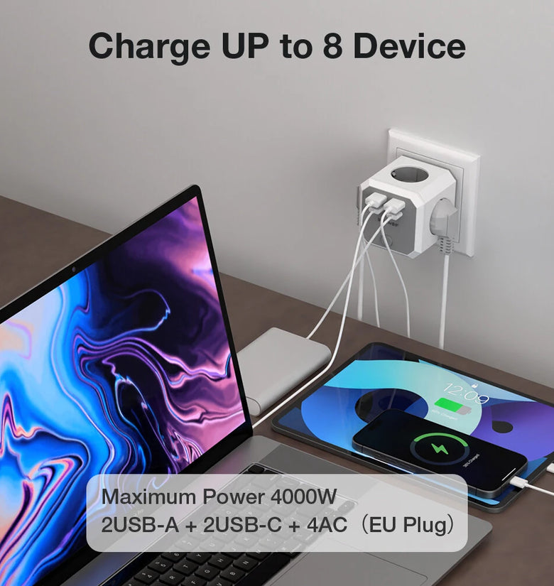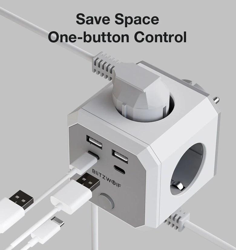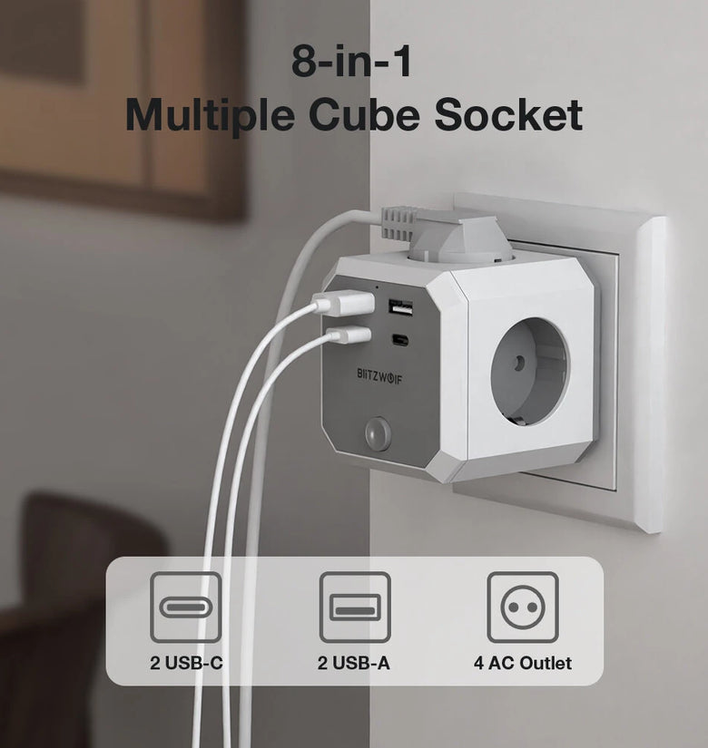 • BlitzWolf BW-EC2 8-in-1 Wall Cube Socket EU Plug Power Outlet Extender 4000W with Switch 4 AC Outlets / 2 USB-A / 2 USB-C for Home Bedroom Travel
